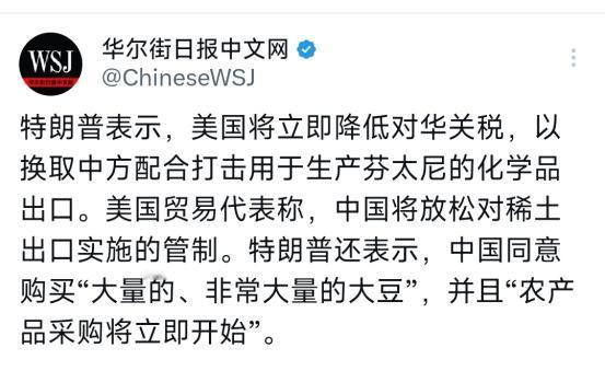 中美会晤结束后,华尔街日报今天(10月30日)下午报道:“特朗普表示,美国将立即降低对华关税,以换取中方配合打击用于生产芬太尼的化学品出口。美国贸易代表称,中国将放松对稀土出口实施的管制。特朗普还表示,中国同意购买‘大量的、非常大量的大豆’,并且‘农产品采购将立即开始’。”   先说说关税和芬太尼这对交换条件,2025年1月特朗普开始第二任期后,就拿芬太尼当借口,2月就给中国输美产品加关税,之后越加越狠。中方的反制关税也没含糊,立马就跟上了。   可关税战打下来,美国自己先扛不住了——美股半个月就没了4万亿美元市值,家电、日用品这些老百姓常买的东西全涨价,不少人都开始囤货,摩根士丹利、高盛这些大投行也接连下调了美国经济的增长预期。   中方这边,虽说靠金砖、RCEP这些合作拓展了不少海外市场,但美国毕竟是个重要的出口地,高关税压得不少出口企业喘不过气。   而芬太尼确实是美国的大麻烦,每年因为过量致死的人一直居高不下,白宫早就把这事儿当成民生头等大事抓,之前老说中方出口的化学品被用来非法生产,其实中方一直都在管制,只是美方总觉得力度不够。   这次用降关税换中方更配合,对美国来说是同时解了通胀和民生两个急茬;对中方来讲,既尽了国际责任,又能让出口企业松口气,算是两边都得偿所愿。   关税的事刚有眉目,稀土放宽管制的消息就让美国高科技行业慌了神。2025年2月中方对仲钨酸铵等25种稀有金属限产后,美国的芯片、新能源汽车行业就没踏实过。   要知道,中国在全球稀土产业链里占着没法替代的主导地位,不管是储量还是加工能力,其他国家短时间内根本没法替代。英特尔、特斯拉这些巨头最受影响,英特尔为了找替代货源,没办法只能花三倍的价钱从缅甸进货;特斯拉柏林工厂甚至因为稀土不够,一度减产。   现在中方放宽管制,对这些企业来说简直是救急,供应链稳了,扩大生产、搞研发的底气才够。   但这可不是中方单方面让步,当初管制稀土本来就是为了保护战略资源、推进产业升级,这次松口也是看在贸易对等的份上——美国高科技行业的需求摆在这里,咱们国内的稀土加工企业也能多拿订单,本来就是双赢的事。   最让美国农场主高兴坏了的,还是中国答应买“好多、特别多的大豆”这事儿。中国一直是美国大豆最主要的出口买家,可自从2025年5月贸易战升级后,中方就没再买过美国大豆,9月份的进口量干脆跌到了零,去年同期还有170万吨。   这大半年下来,美国农场主惨透了——大豆堆在仓库里没人要,价格从每蒲式耳10美元跌到7美元,不少中小农场主全靠政府给补贴才撑得住。特朗普之前一边骂中方“搞经济对抗”,一边放话要断了食用油进口,那股急劲藏都藏不住。   现在中方承诺马上开始采购,农场主们总算能清库存、稳价格了,不少人已经开始联系货运公司,就等装船发货。   对中方来说,这也是实打实的需求——国内饲料、豆制品加工这些行业每年要消耗巨量大豆,之前转从巴西买虽然能顶一阵子,但多一个供应渠道就能降低断供风险,要是能谈个好价钱,对国内企业也划算。这种互补性的贸易,本来就该是双赢的局面。   其实这次谈成共识,早有迹象。从5月日内瓦会谈取消了91%的加征关税,到8月斯德哥尔摩会谈把剩下的关税暂停了90天,两边一直在互相试探、磨合。   毕竟打了大半年贸易战,谁都没捞到真正的好处——美国制造业没像预想的那样流回本土,中方的产业升级也没被拦住,反倒把全球供应链搅得乱七八糟。   这次会晤把关税、芬太尼、稀土、大豆这些核心矛盾一次性捋顺了,说到底还是两边总算明白“对着干没好果子吃,合作才能都划算”的道理。   现在最忙的要数中美两国的企业:中国出口企业忙着算关税降了之后能多赚多少,准备重新抢回美国市场;美国高科技企业赶紧跟中国稀土供应商对接订单;大豆贸易商更是连夜就把采购的细节敲定了,就怕耽误了“马上开始”的承诺。   当然,这并不意味着中美经贸摩擦就彻底消停下来了。美国之前把50多家中国高科技企业列进“实体清单”,中方也有自己的出口管制和不可靠实体清单,这些分歧不是一次会谈就能解决的。   但这次谈成的共识,至少给后面的合作开了个好头,也给全球经济吃了颗定心丸。毕竟中美是全球最大的两个经济体,咱们俩的经贸关系稳了,全球的供应链才能稳得住,经济复苏才有底气。   值得提一句的是,这次的共识全是对等交换,没谁是单方面吃亏让步的——美国降关税换芬太尼合作,中方放宽稀土换市场机会,大豆采购本来就是互补需求的正常结果。   这正好说明,平等互利才是经贸合作能长久的根本。接下来就看两边能不能兑现承诺了:关税到底降没降到位,芬太尼管控管得到底有没有用,大豆采购是不是真的“马上就开始”,这些细节才决定后面的合作能不能持续。
