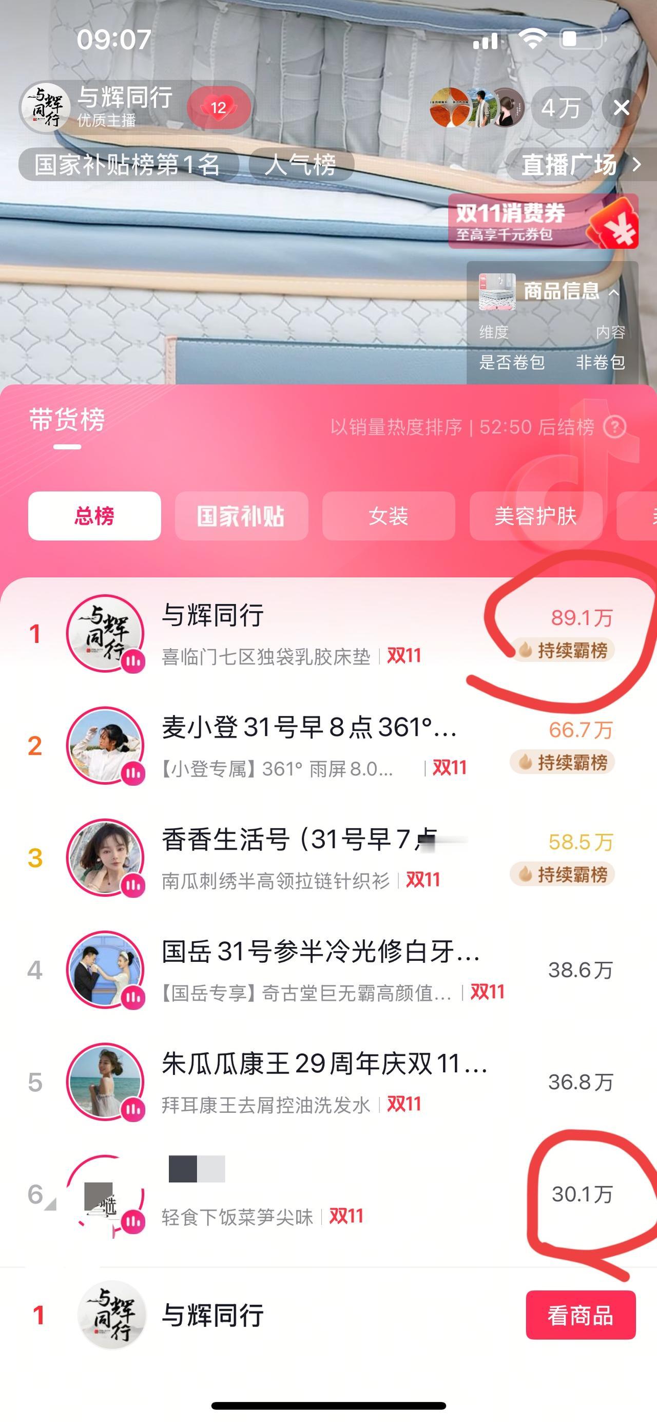 哇,不容易, 直播间终于有了一万加人气, 总榜第六了, “真爱粉”终于又可以嗨起来了。 今天好像是什么江西专场, 我看短剧的时候刷到的广告, 点进去一看, 是高傲的“背手姐”在直播, 人气和热度值都不错, 看来今天的业绩应该会再一次惊艳。 最近双十一平台福利好, 他们的业绩水涨船高, 昨天四个桶装的也不少, 450+650+250+550, 合计1900万, 老板说两个公司收入100亿, 看看这每天的业绩, 感觉老板的话里面有太多的水分。 故事有人讲, 肯定也有人会信, 反正讲故事的以为是真的, 相信的人也以为是真的, 大家图一乐呵, 开心就好。 看到有个朋友这样形容这个公司, 我觉得太经典了。 “你说他是卖品牌产品公司, 各大商超没见过这个品牌。 你说他是直播带货公司, 直播间人数不上万, 那他是什么公司? 总结就是讲神话故事公司。 忽悠一群失去思考能力的人!” 散会! 直播带货排行