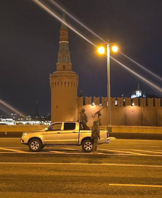 在无人机可能袭击莫斯科的背景下,这张照片在俄国内社交媒体上热传。 这是一支能够快速机动的防无人机小分队。一辆皮卡,一个机枪架和至少两名全副武装严阵以待的士兵,在莫斯科秋季的夜晚,坚守在莫斯科克里姆林宫一角。