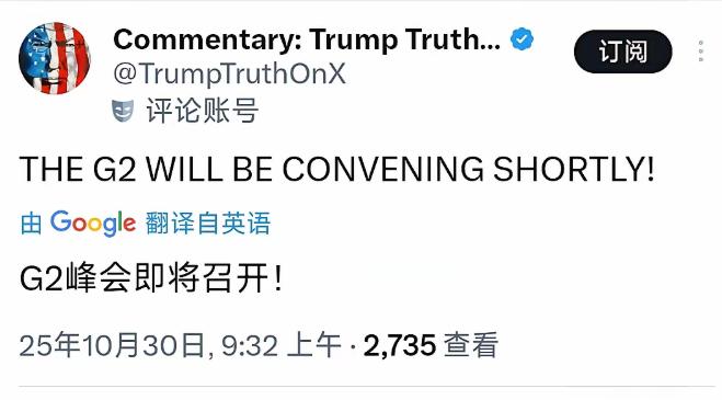可以看得出这次会谈,特朗普很看重也很兴奋,当中方专机刚刚在釜山落地,特朗普就兴奋地发了一个推特,内容是“G2峰会即将召开” 所谓的“G2”,其实就是特朗普自己定义的,和他组建的“G7”是差不多一个性质,西方那边是七个国家强强联手,但现在特朗普又想和我们联手。 他能提出这个字眼,其实也是代表着认可中国的强大,所以想组建一个两个强国的联盟,通过这种方式来共同主导国际事务走向。 事实上,关于他这个说法,中方是一直不认可的,毕竟我们所追求的从来不是“恃强凌弱”,而是构建一个多元化的世界,大家共同发展,共同推动全球的进步与繁荣。 其实早在奥巴马时期,他就提出过“G2”,相比现在的实力,当时的我们还处在于奋力追赶,甚至还有些吃力的状态,那时候提出的“二人组”本质上不是看你强,而是想要你做跟班。 所以当时我们就很明确地拒绝了,也是自那时候开始,重返亚太、各领域全面打压倾泻而来。 但如今不同了,我们的反击不再是“以卵击石”,而是真正的拳头。 所以这一次特朗普会谈,特朗普少了见日韩时的戏谑,反而整个人变得正经起来。可以看得出,特朗普将很多希望都放在这一次会谈中,有些事能不能解决,能不能有所缓解,就看这一天了。
