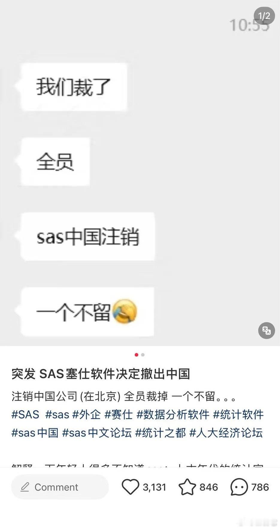 ❗️ 著名软件公司SAS(塞仕)撤离中国已成事实,其突发性(10月30日)裁员与高时效补偿引发关注,并成为全球科技企业调整战略的典型案例之一。