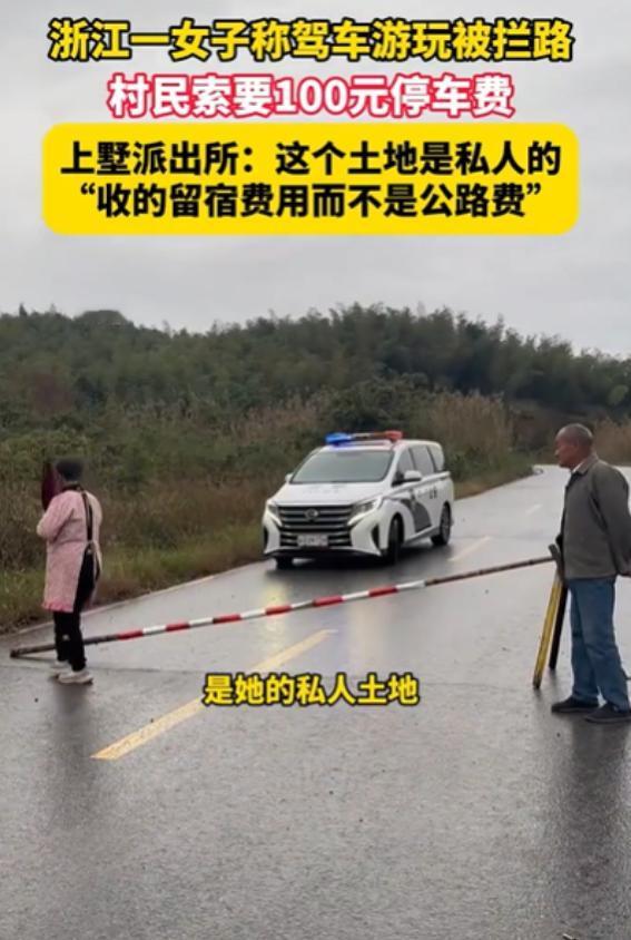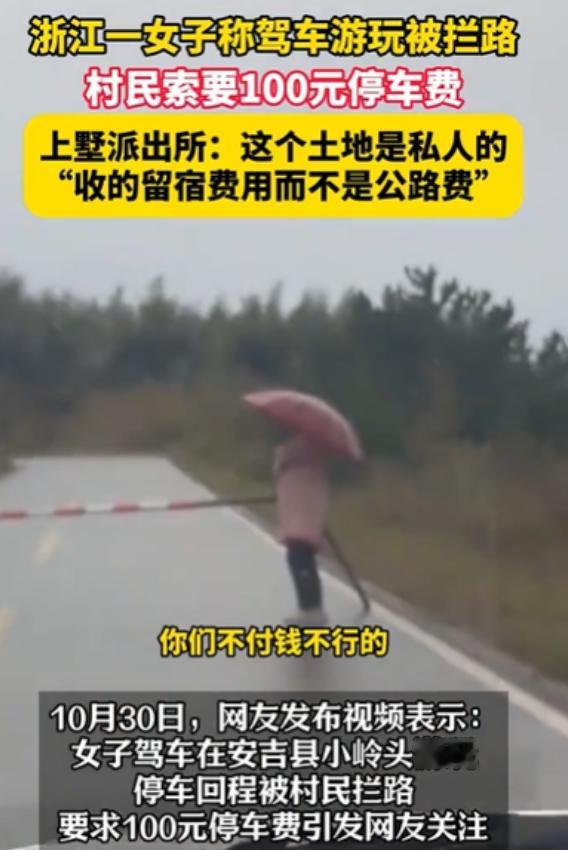 浙江一女子开车出去玩,结果遭村民拦路,索要100元停车费,不付钱不准走,女子认为,公路是国家的,对方没有权利收钱,直接选择了报警,还录了视频当证据,没想到,最后还是付了钱!派出所解释:这土地是私人的,收的留宿费而不是公路费! 10月30日浙江湖州安吉县小岭头的清晨,天刚蒙蒙亮,自驾游客准备发车返程,车头突然被两根横杆拦住,扛杆的中年妇女上前开口就要100块,说这是“留宿费”,不掏钱别想走。 女子一下懵了,前一晚找停车点时,这片荒地看着清净,只插着块模糊木牌写“私人场地,提供露营”,没见任何收费标识,也没人过来搭话。 她就把车停这儿,后排座椅放倒歇了歇,根本没露营,怎么突然要收钱? “公路是国家的,你凭什么拦路收费?”女子据理力争,妇女往路中间一站,用伞挡住脸:“别拍,拍照犯法!我拦车不犯法,这地是我家的,所有人来都给钱,”旁边几位大爷大妈也围过来,横杆死死抵着车头。 女子掏出手机录视频留证据,当场打了110,等民警赶来时,路边已经围了些看热闹的人。 她跟民警抱怨:“哪怕10块20块,提前说清楚我都认,这不明不白要100块,不是坐地起价吗?” 上墅派出所民警现场核实,确认这片没铺柏油的空地真是村民私人土地,排除了占用国家公路收费的说法。 但民警也坦言,这事儿不是头一回发生,之前早提醒过村民立明确标识,可一直没落实。 调解时民警坦言物价问题得找市场监管,他们只能协调,看着僵持不下,又考虑到民警出警不易,女子松了口,最终双方谈妥,女子扫了50块,村民才挪开横杆。 可这钱付得窝火,女子后来特意跑了趟安吉信访局,就想讨个说法,她不是掏不起钱,是受不了这“先停车后要钱”的套路,要是进门就有提示,愿意留就留,不愿留早掉头走了,哪用闹到报警。 记者跟着追访,才发现这事儿里还有不少弯弯绕,江南天池度假村先撇清关系,说视频里是观音堂那边的村,跟他们没关系,他们这儿都是机器收费,打观音堂露营地电话,一直没人接。 上墅乡政府和天荒坪镇政府也互相推,一个说景区归对方管,一个说村民个人行为该自己协商,文旅局更无奈,说这是村民自发行为,他们没执法权,只能靠乡镇协调。 其实核心症结就藏在“没说清楚”这四个字里,村民觉得自家土地收费天经地义,却忘了游客没读心术;游客反感的不是付费本身,是这种“被动消费”的憋屈。 民警调解时也着重强调,已经再次要求村民赶紧立牌子,把收费项目、价格写明白,别再让误会发生。 这事儿传开后,不少人都有共鸣,出门玩图的是顺心,哪怕私人土地要收费,提前把规则摆上台面,游客有得选,村民也落得踏实,要是总搞这种“拦路要钱”的操作,坏了地方口碑,最后亏的还是自己。 眼下50块钱结了纠纷,但村民会不会真的立起标识,下次再去的游客还会不会遇到这种糟心事,谁也说不准。 毕竟明码标价才是规矩,藏着掖着的“糊涂账”,从来没人愿意买账。
