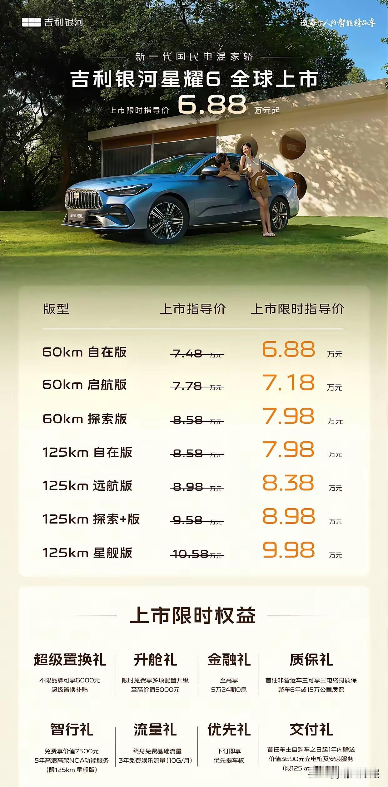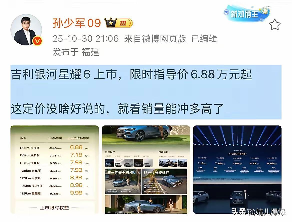 吉利银河的星耀6上市了, 看这个售价和配置, 简直就是照着比亚迪秦plus打的啊![我想静静][我想静静] 你卖798,我卖688, 你3L油耗我就2L, 你有天神之眼我有千里浩瀚, 我还续航1700公里![我想静静] 看来比亚迪最大的竞争对手不是合租品牌燃油车,而是吉利银河![笑哭]