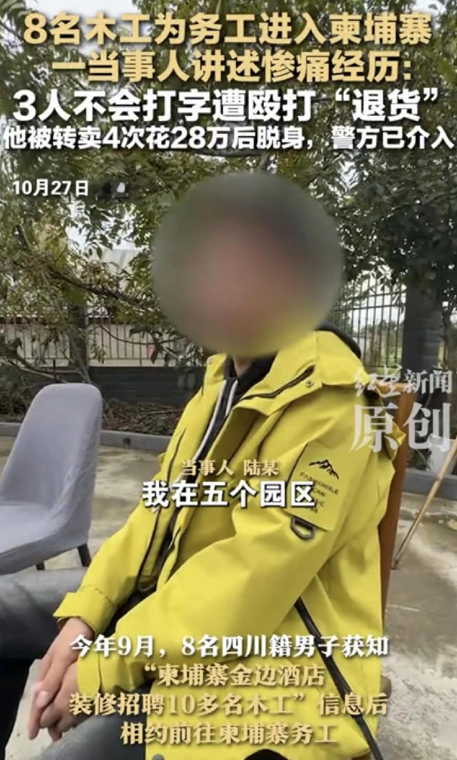 经历惨痛! 8名木工为务工进入柬埔寨被转卖,其中一名当事人讲述,有3人因为不会打字,被殴打“退货”,而他本人则被转卖4次,最终花28万才能离开。 现在东南亚特别是柬埔寨、缅甸和泰国这三国家成为打工陷阱,高薪的诱惑。 跟团去旅游还可以,单独去都有危险,如果是工作有关的,那一定要远离,一旦落地了,你就不是你了,完全失去了自由。 千万别去,否则你就是行走的人民币。