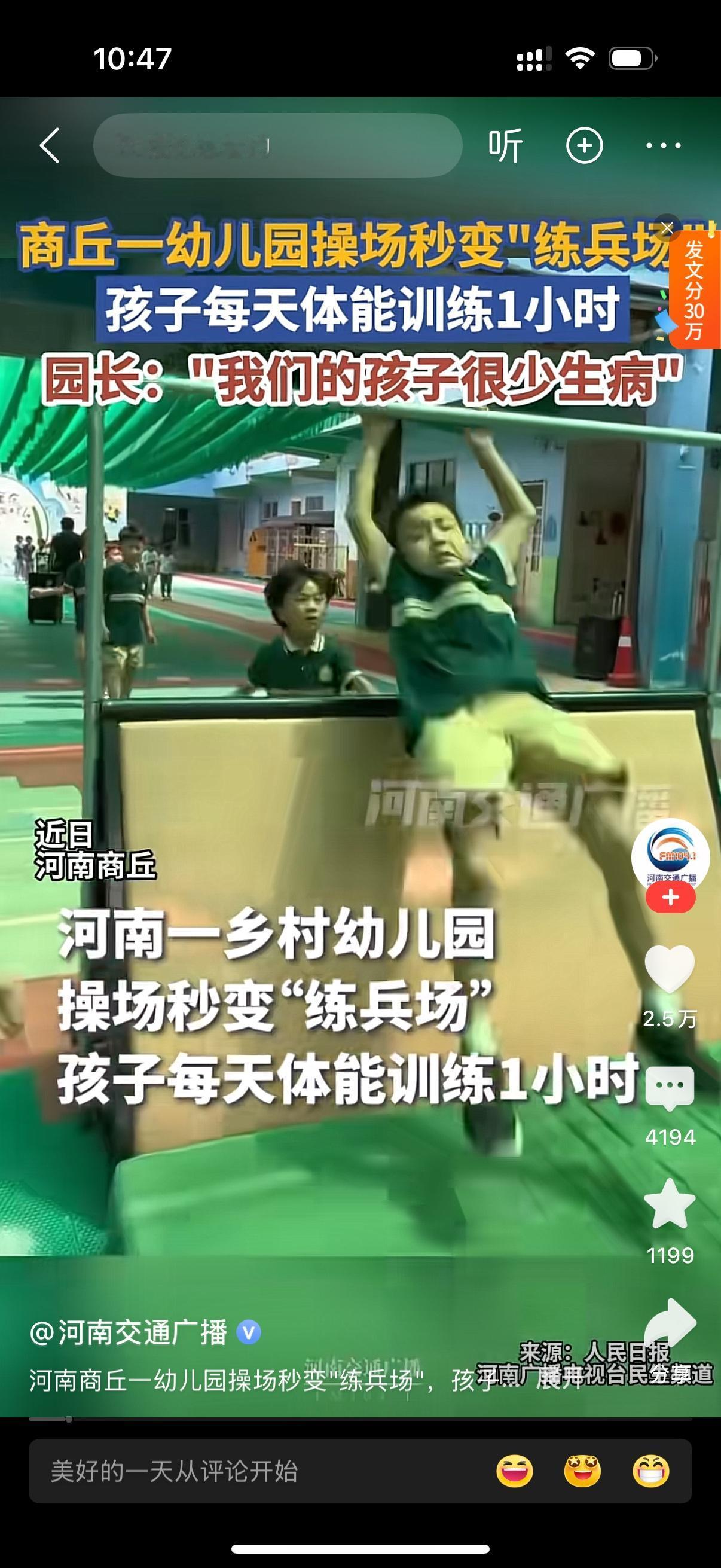 河南一乡村幼儿园秒变练兵场。孩子每天体能训练一小时。小孩个个生龙活虎,精神气十足。园长也说我们这里的小孩很少生病,就得益于幼儿园充分的锻炼。但也有一些家长是玻璃心,他们担心小孩太小,受不了这种高强度的训练,提出停止这种教育模式。哎,这些家长,真是不可理喻。