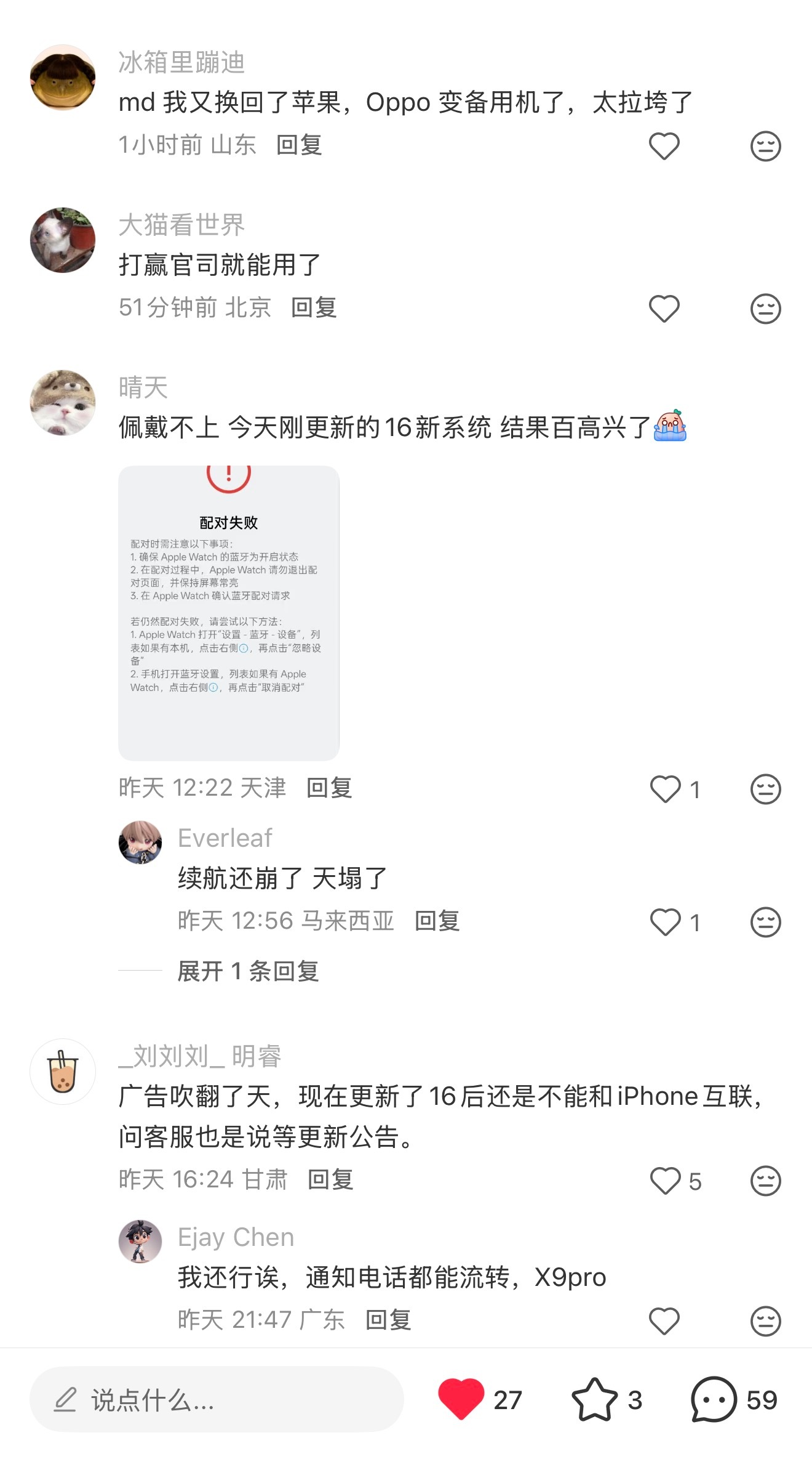 结果普通用户买到手发现根本无法Apple Watch,问客服也是一问三不知,问微博官号也是装作看不到,连个相关的解释都没有,OPPO你这做的对吗??