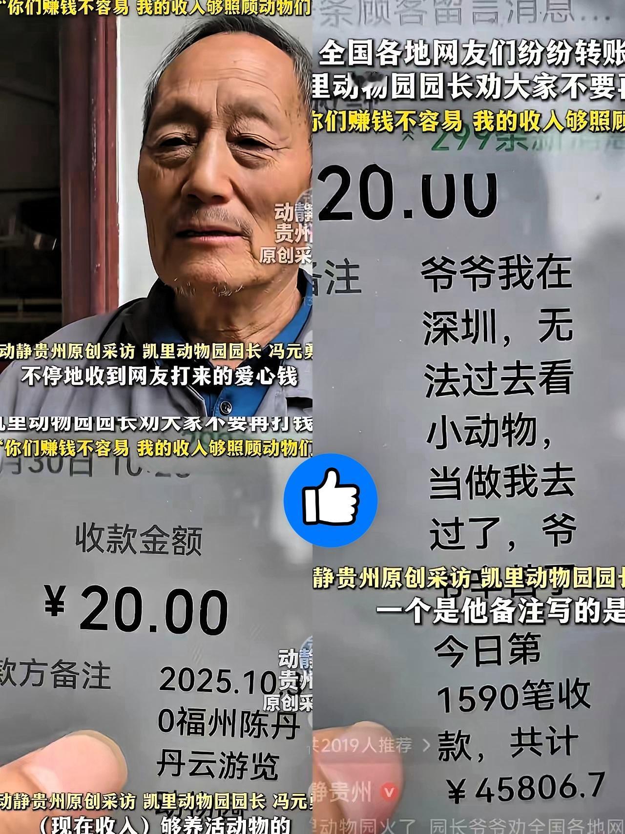 凯里动物园园长突然爆火了! 70岁爷爷守着深山动物园10年不涨价,反而被全国网友“逼着”收钱! 凯里这家长在半山腰的动物园,门票20块钱卖了十年,偏僻到本地人都未必知道。 可园里的老虎、黑熊全是白白胖胖的,原来都是园长爷爷自掏腰包补贴,自己省吃俭用也得让动物吃饱。 网友把这事发到网上,没人组织却心有灵犀,清一色转20块“云门票”支持。 可爷爷反倒急了,赶紧叫停说“够花了,你们挣钱也不容易”,还想把爱心钱做成动物救助基金。 这哪是简单的捐款啊,分明是善良遇到了真诚的双向奔赴。在满是营销套路的当下,爷爷的不涨价、不贪心,才是最动人的底气。