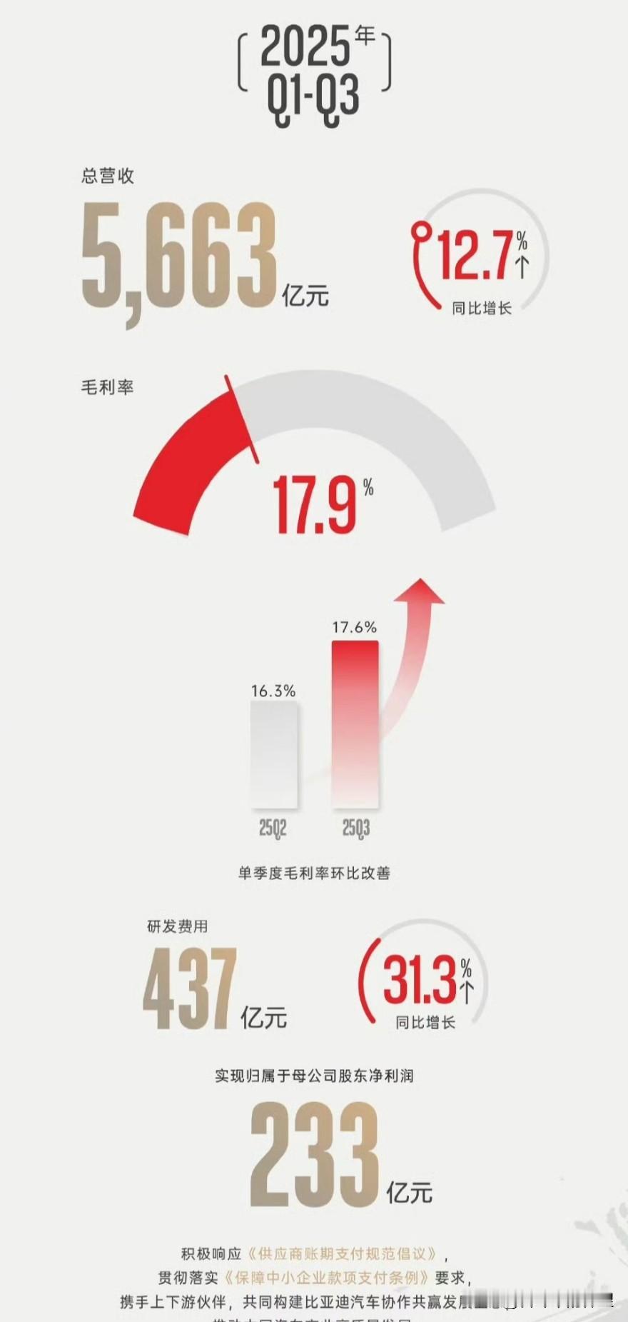 比亚迪2025年第三季度财报! 第三季度营收1949.85亿,净利润78.23亿 前三季度营收5662.66亿,净利润233.33亿 前三季度研发投入437.48亿,同比增长31.3%1-9月比亚迪全球销量3260146辆 1-9月乘用车及皮卡海外销售701579辆 九个月卖了326万辆车,国内的利润却很少,最主要是出口的车子赚钱。九个月的净利润还到一天一亿,比亚迪真是良心车企。让中国老百姓花最少的钱买性价比最高的车,支持比亚迪,支持国产。