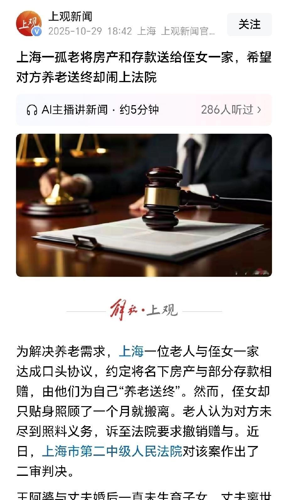 上海,孤寡老人为了能够老有所养,她与侄女一家口头约定,把名下的房产转给侄女一家,还把42.8万存款转到侄女的账户,要求侄女照料她的生活起居。万万没想到,侄女只照顾了老人28天,就以尽到了照顾义务为由,不管老人的生活起居。老人一气之下告上法庭,要求撤销赠与,侄女的解释更是让人直戳脊梁骨。 王阿婆这辈子没生儿育女,老伴走后,她就彻底成为了孤寡老人,一个人守着空荡荡的房子过日子。 眼看着年纪越来越大,腿脚越来越不利索,身边连个端茶倒水的人都没有,王阿婆养老的事儿成了她的一块心病。 思来想去,王阿婆想到了侄女王女士一家。 虽然不是亲生孩子,但总归是沾着点亲戚关系,王阿婆觉得把自己的身后事托付给他们,比外人肯定要靠谱。 于是,王阿婆和王女士达成了口头协议:她把名下的房产和一部分存款都送给侄女一家,条件就是他们得好好照料自己的日常起居,直到为自己养老送终。 王阿婆是真心想换个安稳的晚年,可她没想到,人性经不起考验。 2024年4月,她直接把42.8万元存款转到了王女士的银行账户里;一个月后,又麻溜地把房子过户到了王女士儿子小王的名下。 看着财产都交接完毕,王阿婆心里的石头落了一半,盼着侄女能赶紧过来陪自己,好好过日子。 没多久,王女士就搬过来和王阿婆一起住,刚开始几天,她确实照着承诺,帮着打理家务,照顾王阿婆的饮食起居,家里的开销也都是她在承担。 王阿婆看在眼里,喜在心里,觉得自己总算找对了人,往后的日子有指望了。 可让王阿婆万万没想到的是,这份“指望”只维持了28天。 这天,王女士突然收拾东西要搬走,理由是双方生活习惯合不来。 王阿婆当场就懵了,她把几百万的房子和几十万存款都送出去了,对方照顾了不到一个月就撒手不管,这不是明摆着坑人吗? 看着侄女决绝的背影,王阿婆实在寒心,她多次找王女士和小王沟通,可对方却一口咬定,她已经尽到了照顾义务,是王阿婆太过挑剔,怎么都不满意。 协商无果后,王阿婆一纸诉状把王女士和小王告上了法庭,要求撤销之前的赠与,让他们返还房产和存款。 法庭上,双方各执一词吵得不可开交。 王阿婆表示,赠与财产的核心就是为了养老,可侄女只照顾了28天就不管不顾,完全没履行约定。 而王女士和小王却辩称,他们已经尽力照顾了,是王阿婆太难伺候,不满意她的照顾,这才出此下策。 法院审理后认为,虽然双方没签书面协议,但结合事实能够明确,这是一份附有扶养义务的赠与合同,王女士一家是共同受赠人,合同合法有效。 依据《民法典》第六百五十七条规定:赠与合同是赠与人将自己的财产无偿给予受赠人,受赠人表示接受赠与的合同。 现在王阿婆不认可王女士的扶养方式,王女士也不愿意继续照顾,合同根本没法履行,王阿婆养老的目的也实现不了。 附义务的赠与合同中,实质性义务无法达成,王阿婆作为赠与人,有权依法撤销该赠与合同。 不过考虑到王女士确实付出了28天的时间和精力,还花了些生活费,房屋过户也有费用支出,这些应当由王阿婆承担。 最终,法院酌情扣除了17.8万元,判决小王把房子过户回王阿婆名下,王女士返还25万元存款。 王女士不服这个判决,又上诉到了上海市二中院。 这一次,王女士改变了说辞。 她辩称,当初口头约定的只是在王阿婆死后,帮着料理后事,清明多去烧烧纸,看看她。 至于照顾王阿婆这28天,完全是她额外提供的照顾,早已超出约定义务。不能因为王阿婆单方面不满意就认定没履行义务。 王女士的意思很明确,她拿走房产和钱,只是给王阿婆料理后事,并无生前抚养义务,她已经额外照顾了不少。 王阿婆听了这话更气愤,几百万的财产,就换个身后事和清明扫墓,哪有这样的好事? 《民法典》第六条规定:民事主体从事民事活动,应当遵循公平原则,合理确定各方的权利和义务。 虽然双方各执一词,但结合生活惯例,花费数百万元的财产和仅料理后事的义务明显不对等,根本不符合常理。 综上,二审法院并没有采信王女士的说法,最终驳回了上诉,维持一审判决。 原本盼着亲情能给自己一个安稳的晚年,没想到最后闹到对簿公堂,人性在金钱面前败的一塌糊涂。
