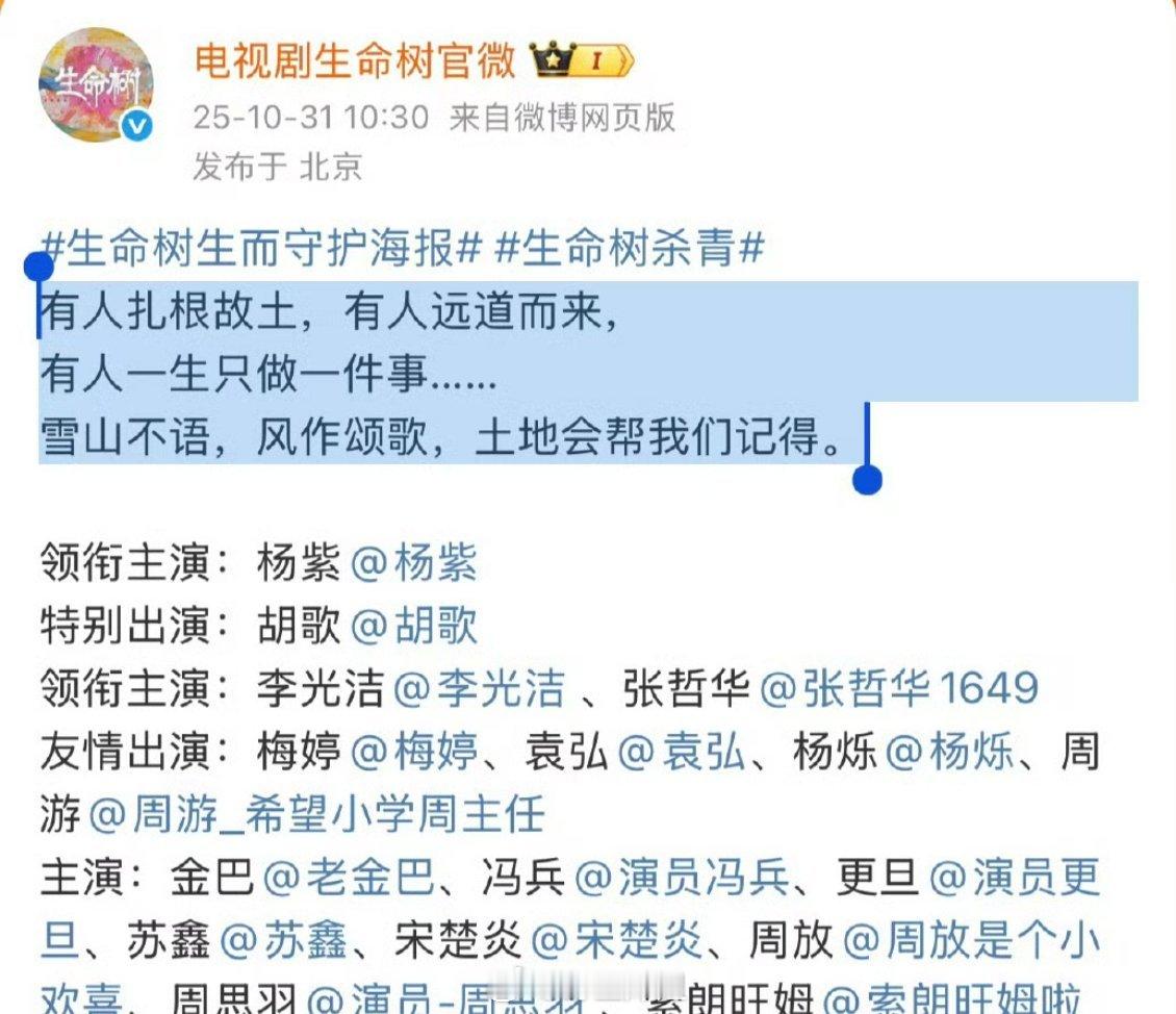 杨紫 胡歌《生命树》的官宣文案真是走心了