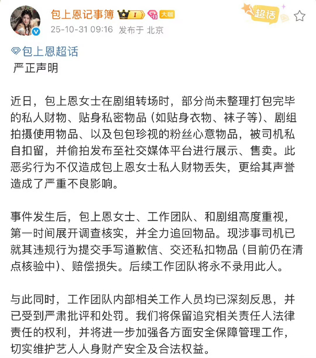 包上恩团队的人说司机私自扣留了包的贴身衣服还和粉丝送的礼物一起售卖,现在让司机谢了道歉信开除了这个司机