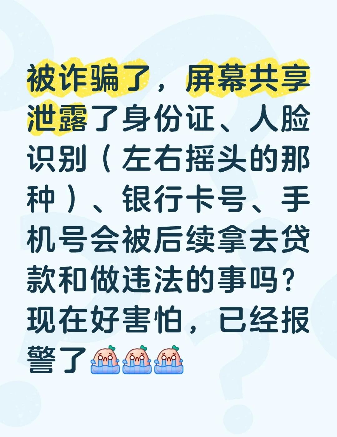 被诈骗了,屏幕共享泄露了身份证、人脸识别(左右摇头的那种)、银行卡号、手机号会被后续拿去贷款和做违法的事吗?现在好害怕,已经报警了[流泪][流泪][流泪] 防止诈骗提高警惕