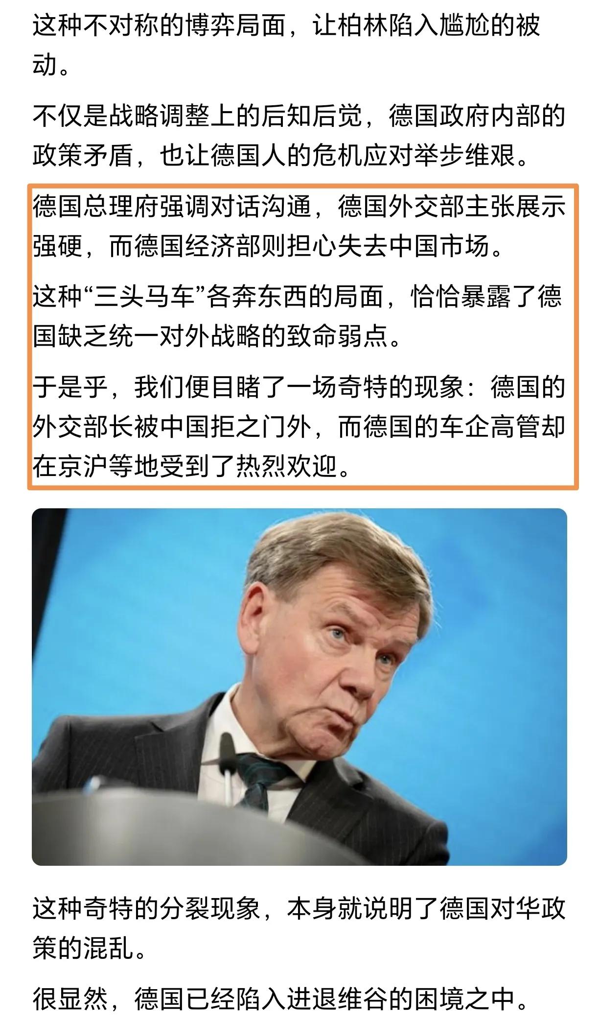 德国政府内部,对华政策会出现“三驾马车,各行其是”的分裂混乱状态。 根源在于欧美西方国家的多党制联合政府制度弊端。 欧洲大选中的政党即使获胜了,如果选票、议会人数达不到绝对性优势,为了顺利能够执政组阁,往往会和其他党派一起联合执政,并且把部分政府高层职位分给其他党派来换取支持。 这样的政府往往会因利益诉求不同,对一个国家、一件事情出现数个不同的声音和态度。 德国在外交上和经济上对我国的态度如此两极分化,就是因为德国现在主持外交、经济两个领域的官员属于不同的政党。 不单是德国如此,西欧国家对我国出现类似这样精神分裂操作的政府也不在少数。 德国外交 欧盟德国 德国困境 德国政府 德国欧洲战略
