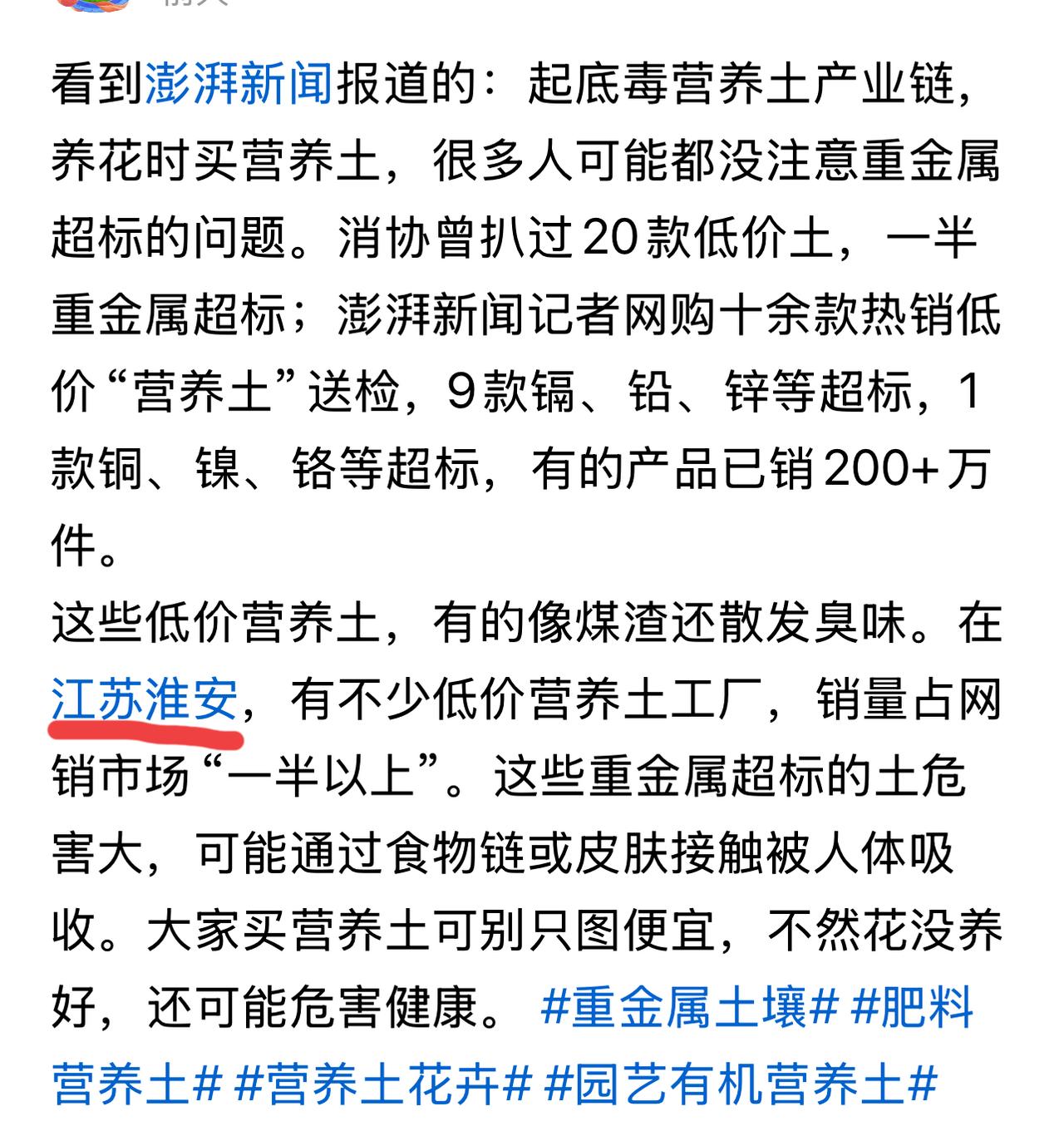 澎湃新闻网暗访:你买的营养土,重金属可能超标。种出来的瓜果蔬菜吃了后可能导致重金属进入体内,严重危害身体健康。 实在丧尽天良! 便宜的营养土千万不能买!肥料营养土 无公害营养土 营养有机土