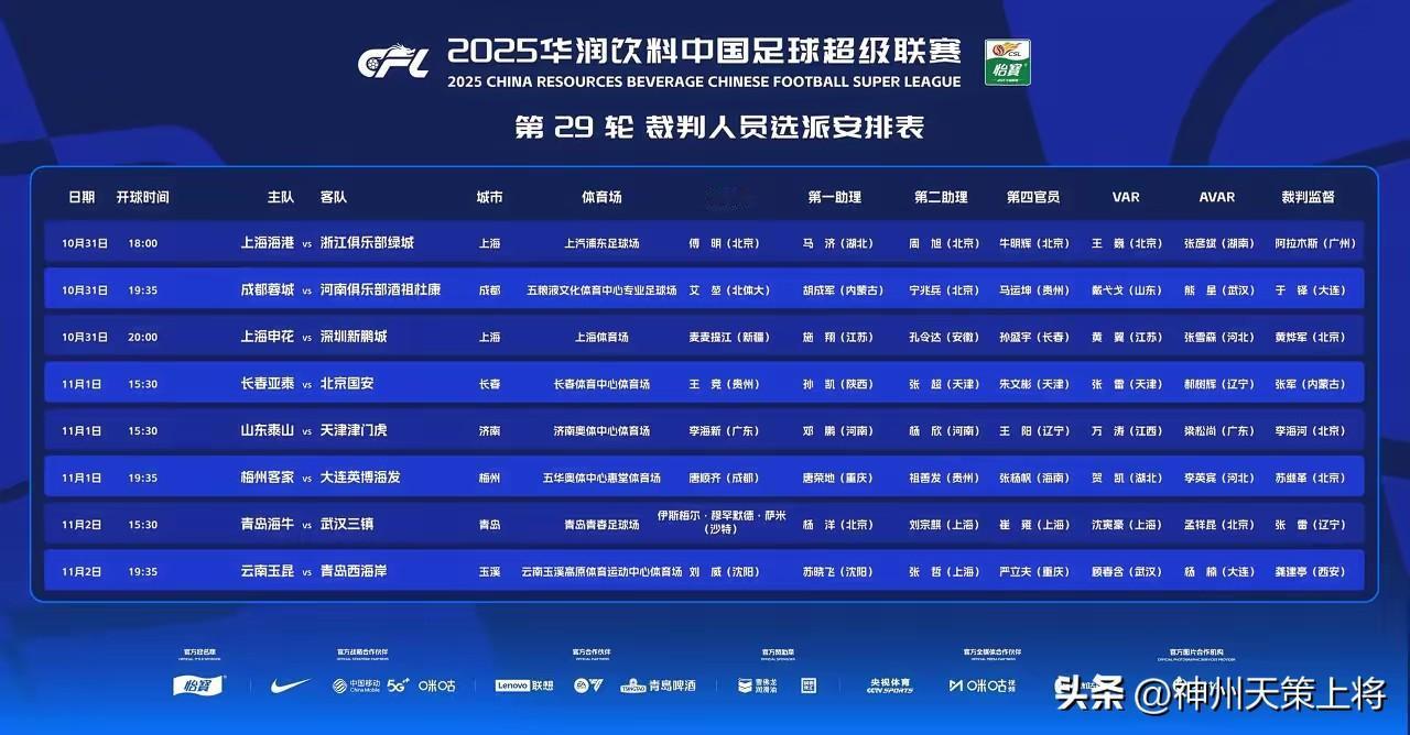 本轮中超联赛裁判选派名单已出,各中超诸侯球迷一片哗然。涉及争冠的球队全用的土哨,本轮唯一的洋哨是来自于沙特的嫩哨,将执法青岛海牛主场与武汉三镇的中超保级战。 从本轮裁判选派名单看出,傅明、艾堃、麦麦提江、王竞、李海新、唐顺齐、刘威、戴弋戈、张雷、顾春含、沈寅豪等颇具争议的裁判一一亮相。 回顾过往,傅明曾因“争议判罚”引发球队申诉潮;张雷在关键战役中的判罚也曾被老帅吴金贵吐槽你可长点心吧。球迷对其执法尺度的质疑声从未间断;麦麦提江的判罚也曾因“偏向性”引发“保花杯”的讨论潮…… 这些裁判的集中登场,让本就对本土裁判公信力存疑的球迷更加焦虑,不少人在社交平台直言“争冠战交给他们,中足联这次连演都不演了?” 中超