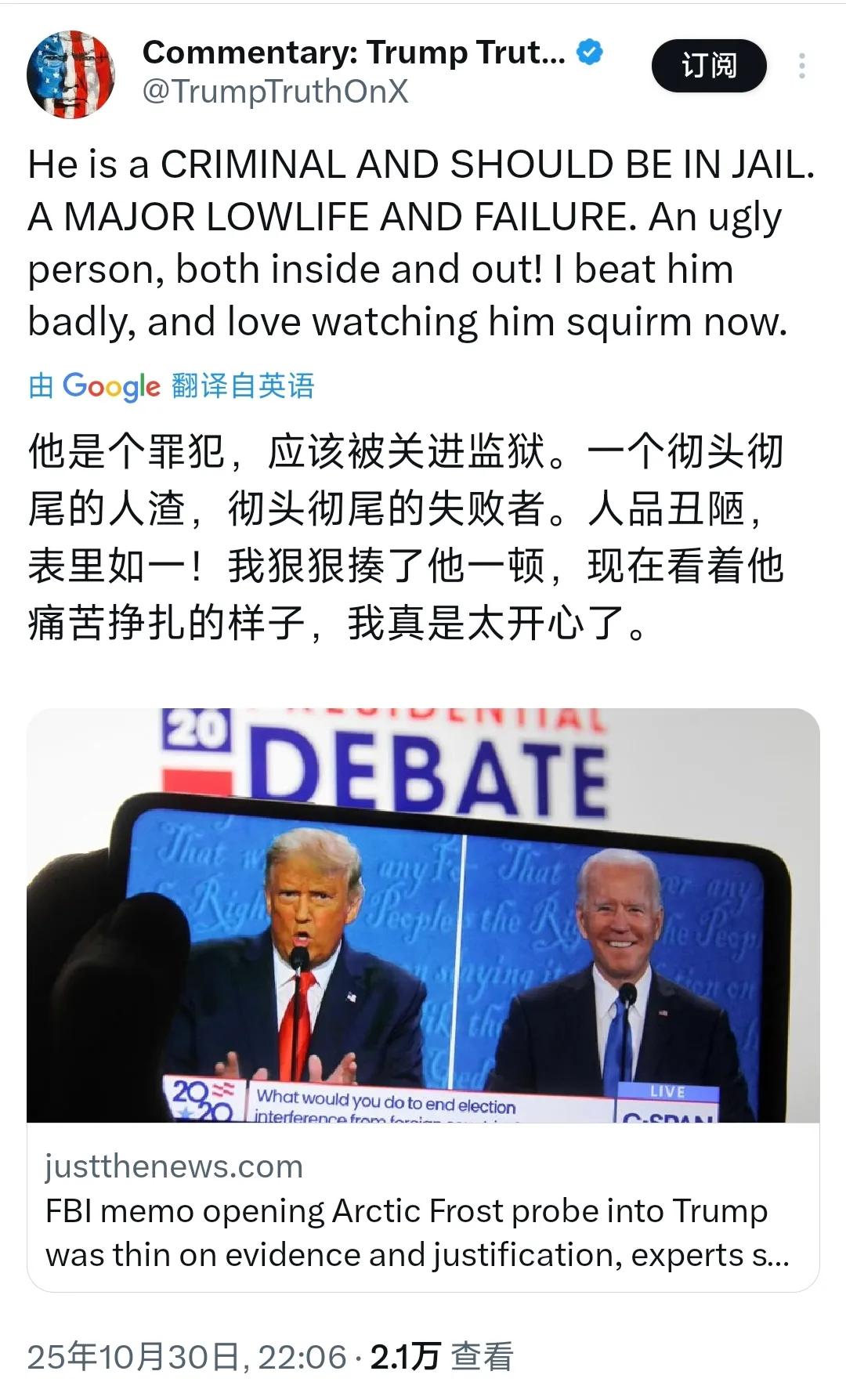 还在“空军1号”上的特朗普又开始抨击拜登。他昨晚(10月30日)写道:“他是个罪犯,应该被关进监狱。一个彻头彻尾的人渣,彻头彻尾的失败者。人品丑陋,表里如一!我狠狠揍了他一顿,现在看着他痛苦挣扎的样子,我真是太开心了。” 从行文语言风格上看,毫无疑问这是特朗普本人所为。不知他这次亚洲之行心情有多郁闷,满腔怒火全部撒到拜登身上。特朗普认为他在2017年就制定了“国家关键矿产安全战略”,但拜登执政这四年人事不干,尽管成立所谓“关键矿产联盟”但一事无成,丝毫没有动摇中国的垄断地位;挑起的俄乌冲突至今都收不了场,严重破坏和延误了他制定的印太战略,让中国的综合国力、影响力反而愈加强大。特朗普越想越气,但言语太过粗鲁,让人很难相信出自于大国总统之口。