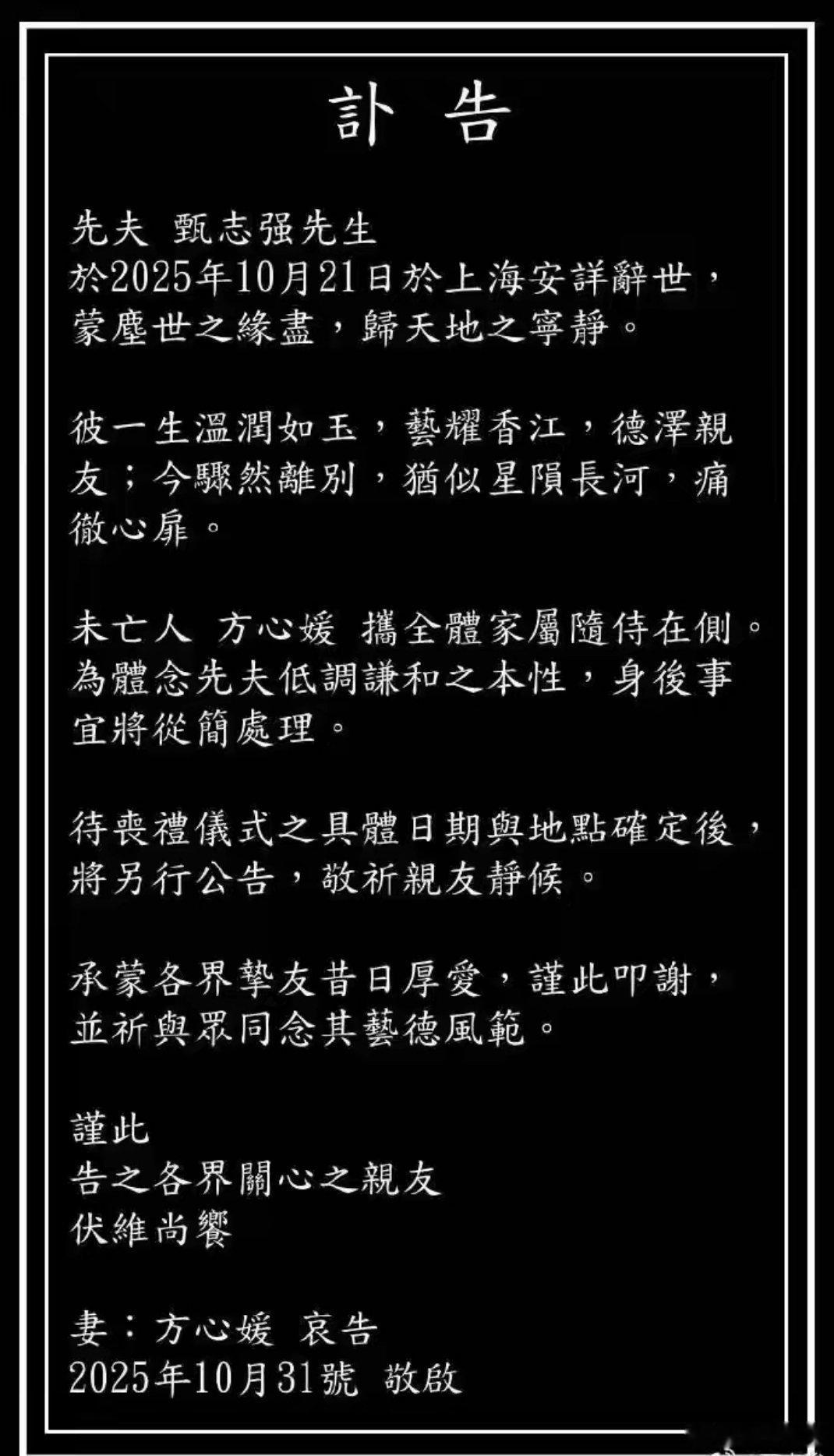 今天,演员甄志强妻子在微博发布讣告,甄志强于10月21日在上海去世。甄志强离世