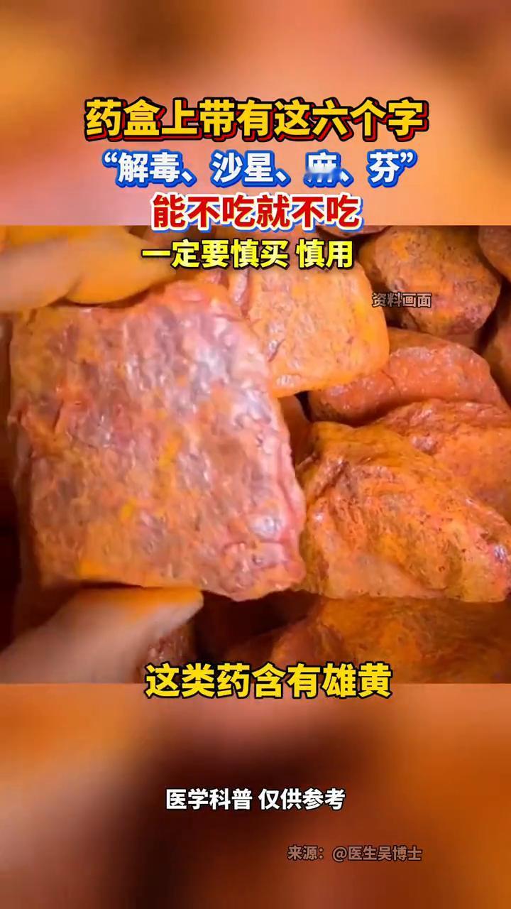 药盒上带有这六个字:"解毒、沙星、麻、芬",能不吃就不吃,一定要慎买慎用。 药盒上带有这六个字的,能不吃就不吃。 ·第一个药名带"解毒"的,像牛黄解毒片,这类药含有雄黄,长期吃重金属堆积,肝肾负荷过重。 ·第二个药名带"沙星"的,如环丙沙星、左氧氟沙星,这类药可能会影响骨头的发育,所以18岁以下的孩子是禁用的。 ·第三个药名带"麻"的,像很多的感冒药里面,麻黄碱容易收缩血管,血压不稳的朋友最好别用。 ·第四个药名带"芬"的,比如布洛芬,有胃病的朋友千万别吃,容易损伤胃黏膜,长期服用可能导致胃溃疡,甚至胃穿孔。中成药的副作用 乱吃消炎药 用 药禁忌 西药名 药品天书 父母必备药品