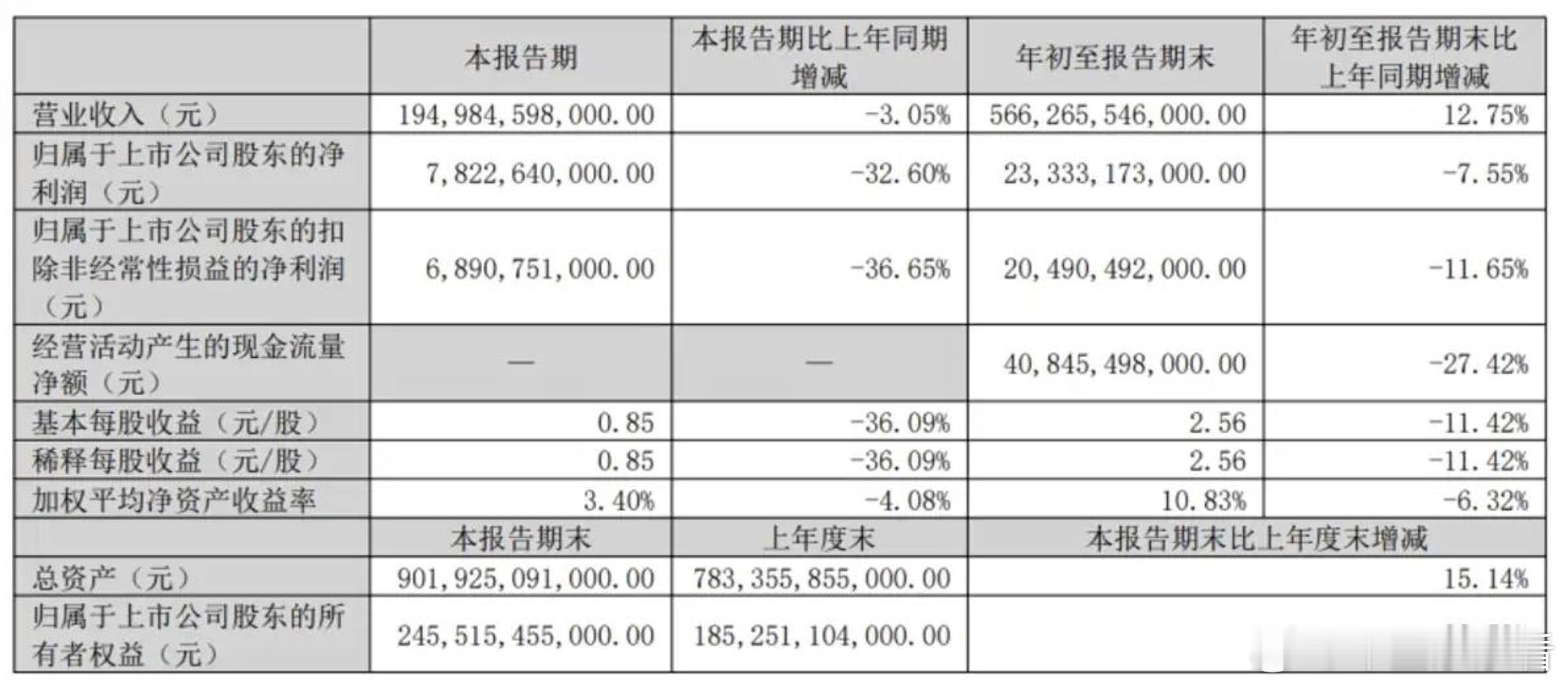 前三季度营收为5662.66亿元,同比增长12.75%;净利润为233.33亿元,同比下降7.55%。