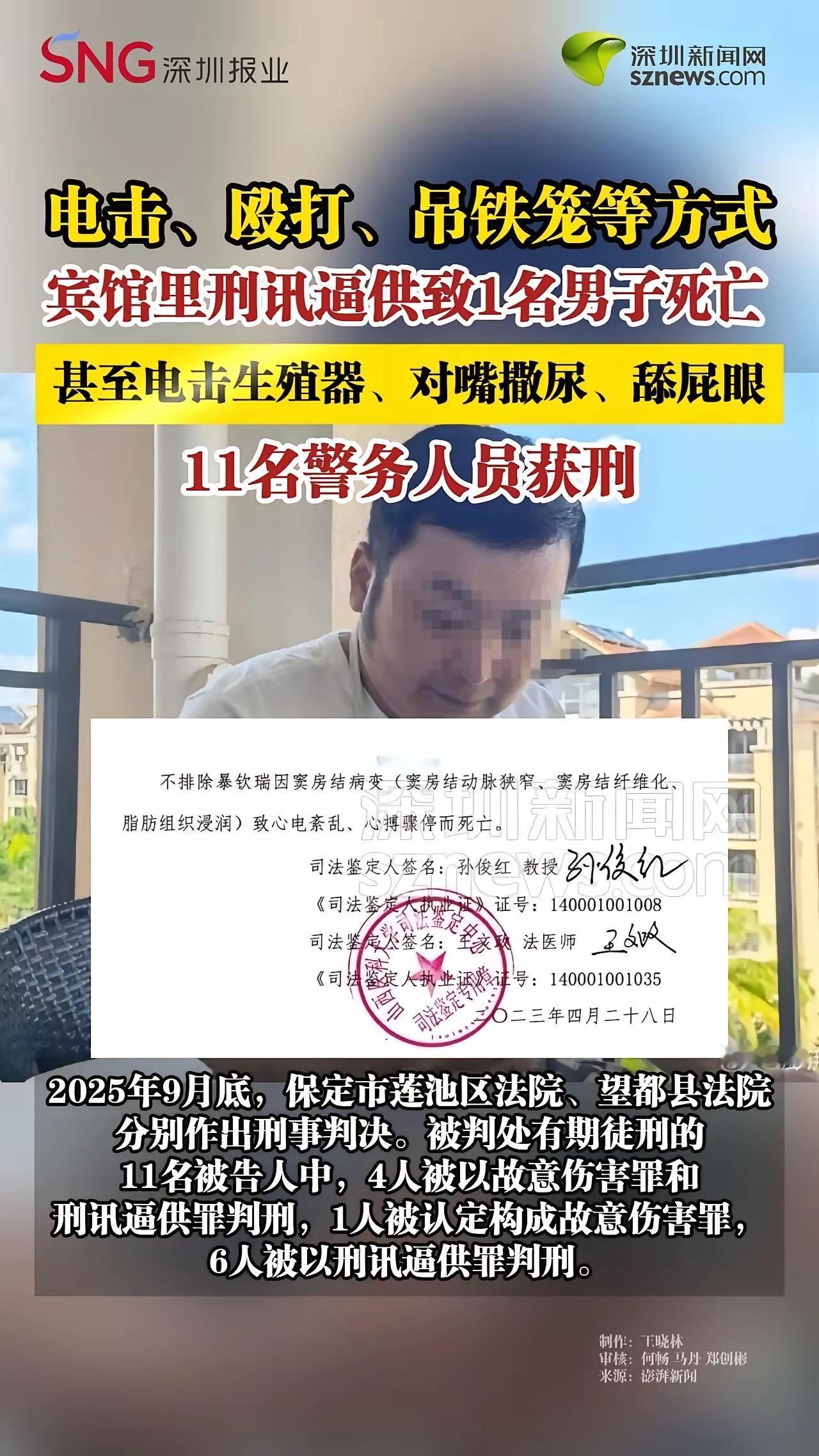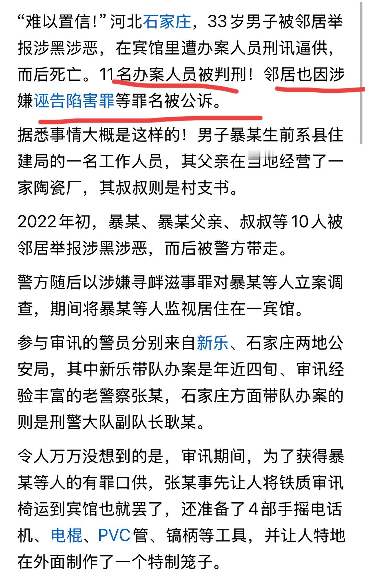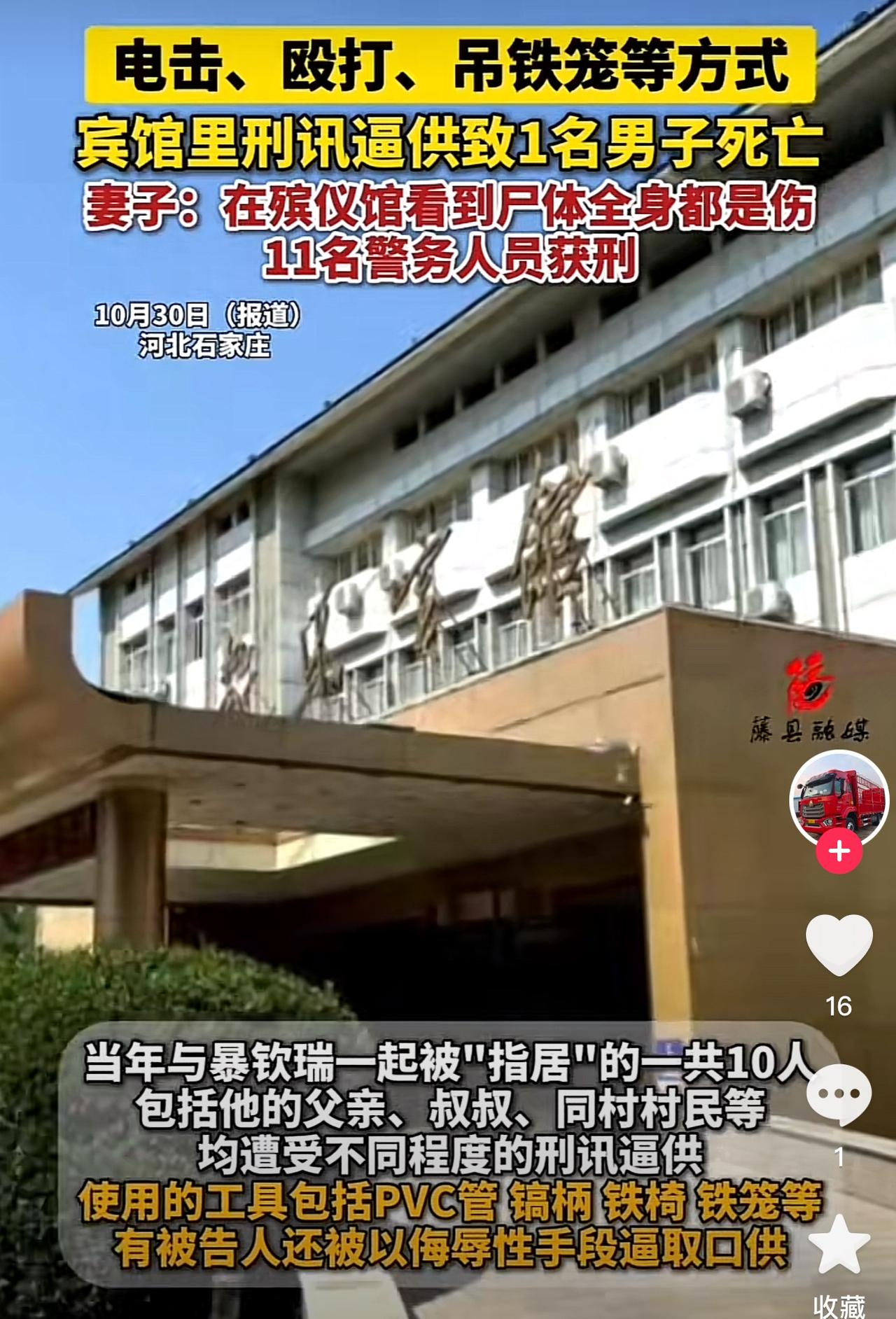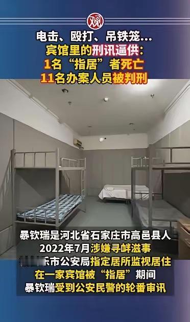 电击,殴打,吊铁笼…… 河北石家庄,一男子因被邻居举报涉黑涉恶,被办案人员在宾馆里刑讯逼供,最终导致死亡。 11名警务人员获刑! 最终邻居也涉嫌诬告等罪名被公诉。