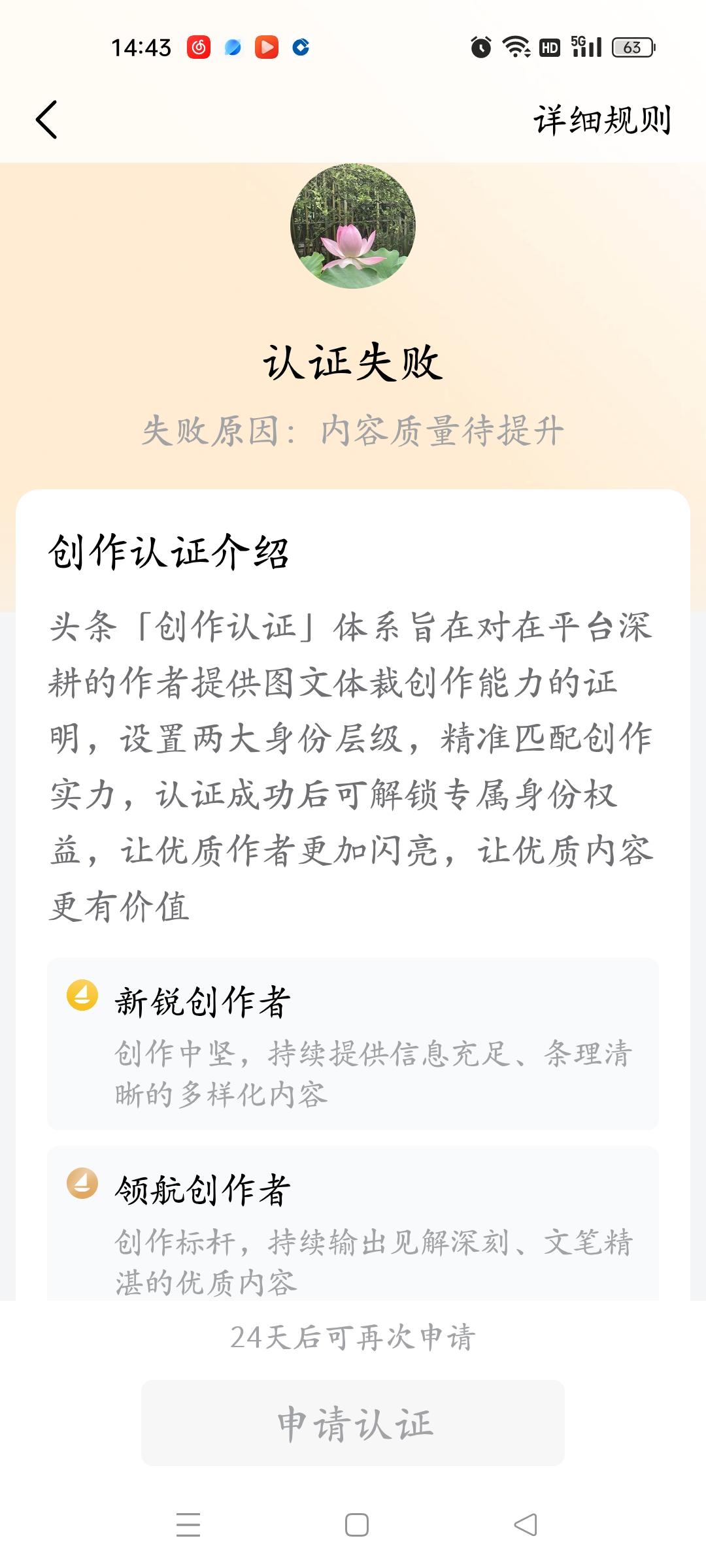 第一次申请“微头条新锐创作者”以失败而告终,被驳回的理由是作品质量有待提升。现在