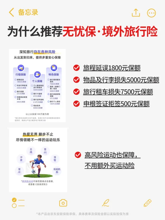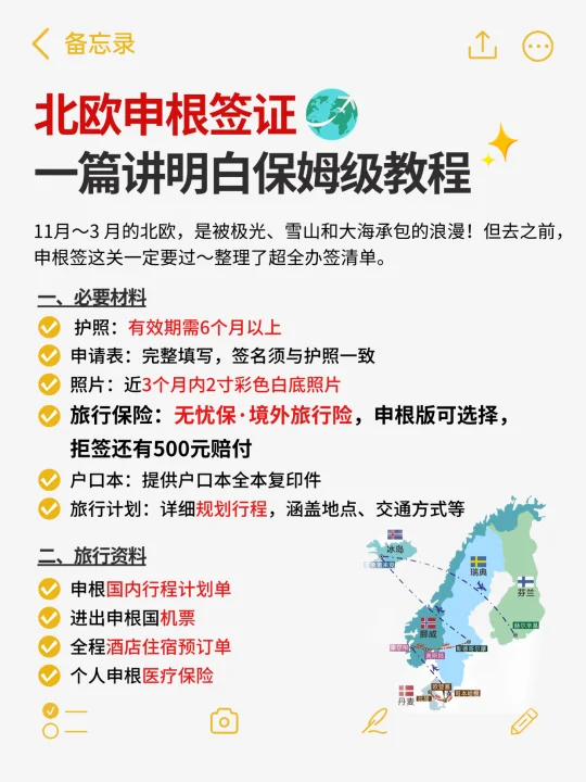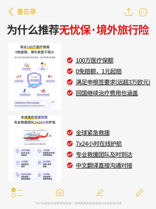 一直向往的北欧,终于是提上日程了,去之前做了大量攻略,分享给需要的姐妹们[飞吻R] . 11月~3 月的北欧,是被极光、雪山和大海承包的浪漫! 但去之前,申根签这关一定要过~ 整理了超全办签清单,尤其申根险选对能省超多心,直接推荐「无忧保・境外旅行险」,合规又靠谱,追极光路上更踏实! · 🌟 申根签证保险的3要点: 1️⃣保额:保额不得低于3万欧元(约30万人民币),同时具备全球紧急救援服务! 2️⃣保障:保险必须包含人身意外保障、🏥保障、救援保障,以及急救和紧急住院费用 3️⃣保期:保险覆盖整个申根区和旅游逗留期,前后留出各两天的缓冲期 · 🌟 为什么推荐「无忧保・境外旅行险」?合规 + 保障双在线! ✔️完全符合申根签要求,办签零踩坑 保额远超标准:医疗保障额度直接给 100 万人民币保额(远超欧盟 3 万欧元要求),使馆审核时不用额外补材料,直接过。还有7* 24 小时全球紧急救援,在国外找不到医院还能电话客服帮忙在线翻译 。 拒签有兜底:万一签证被拒,能申请 500 元拒签赔付,挽回部分签证费损失,不用白忙活一场,对第一次办申根签的宝子超友好。 · ✔️保障比普通申根险全太多,出行更安心 📌 医疗兜底无压力:100 万保额,0免赔额,1元起赔,不仅覆盖住院、门诊,连境外买药、回国后后续治疗都能报。北欧冬季寒冷,在挪威追极光冻感冒、在芬兰吃驯鹿肉闹肠胃,看病费用全报,不用心疼钱 📌 行程意外有靠山:北欧多风雪,航班延误是常事,无忧保也有针对航班延误的保障,每 4 小时赔 300 元,保额1800 元;托运行李延误,有2500元保额,不用在机场干着急! 📌 财物安全有保障:在丹麦哥本哈根步行街、挪威卑尔根鱼市这些游客密集地,手机、相机怕丢?无忧保有随身物品盗抢保障,保额 5000 元,信用卡盗刷还能赔 2 万元,逛吃更放心 📌 高风险运动也保障:想去瑞士阿尔卑斯山滑雪、冰岛蓝湖徒步?常规户外运动全涵盖,不用额外加钱,追极光之余玩得更放开。 · ⚠️和朋友两个人一起买能打 88 折!! 📱上支付宝搜索🔍【京东安联境外旅行险】,就能轻松投保啦,赶紧安排起来 !经常出游的朋友可以直接买个无忧保·境外旅行险年卡哦,一次投保覆盖全年节假日,随时想出发都不用临时急着选保险!