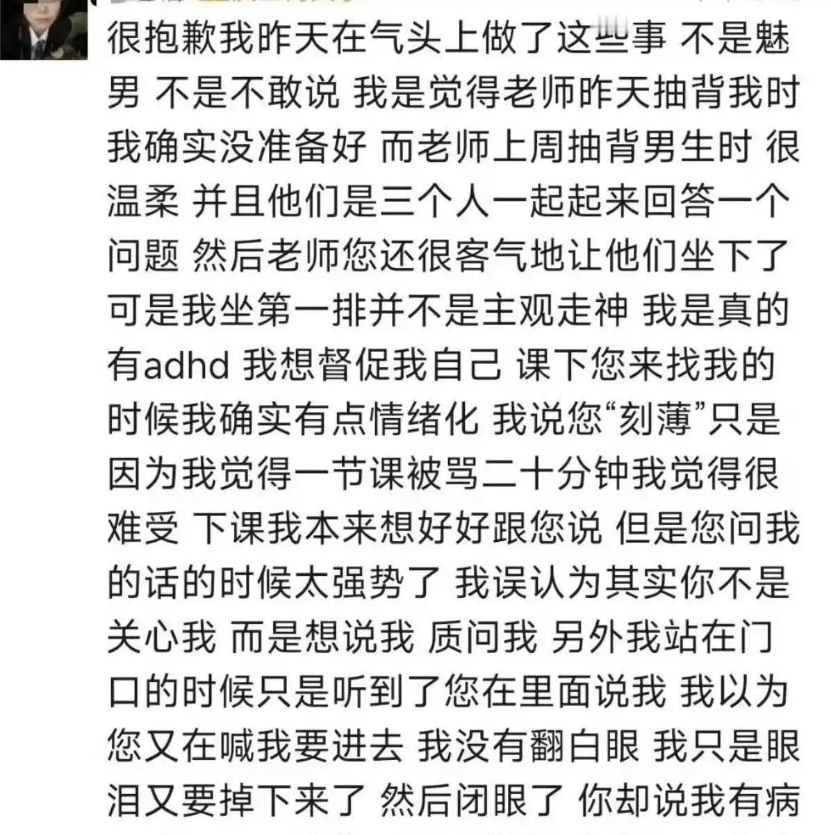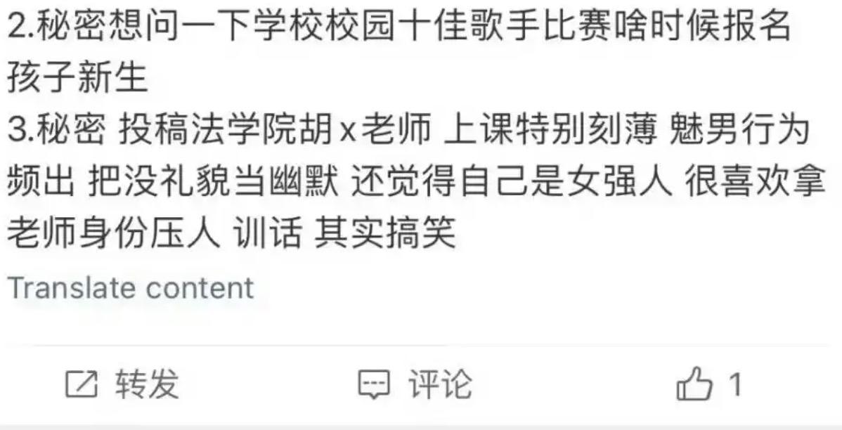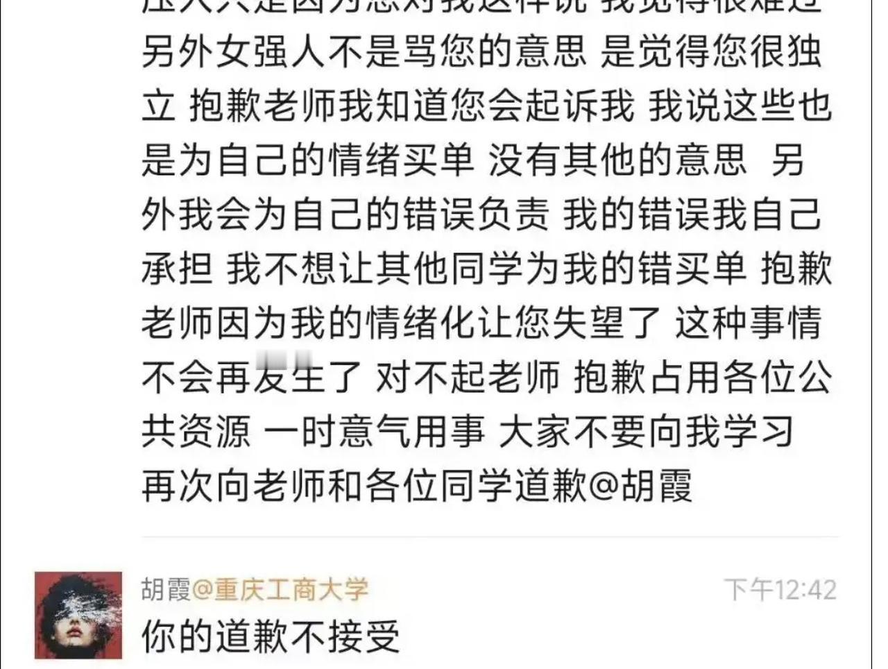 仅仅是因为课堂没回答好问题被老师批评,女大学生就在网上造谣女老师刻薄并且魅男,事后只是发个长文道个歉就想获得原谅,那这个犯错成本也忒低了点! 事情的起因是重庆工商大学大学院一名女生,在上课时没能回答出问题被老师批评,随后就在网上写小作文吐槽女老师存在魅男行为,而且还十分刻薄。这位女老师看到后,就将其所发内容发到学生群内,要求这名学生拿出实证,并且表示已联系平台,找到发布者的信息,准备起诉这名学生侵犯名誉权。这名女生害怕就赶忙发长文向老师道歉。可这名女老师没接受道歉,表示要她承担法律责任,还要把这个案例讲给学生。 首先,说真的看到这起事件,我还是感觉挺可悲的。一个学法的女大学生,在现实生活中做事时,却把法律条文抛之脑后,在没有实证之下随意的用小作文,来造谣自己的授业恩师,这是没有一点法律底线,更是没有一点道德底线。如果以后这样的人,当了法律工作者,手中握有更大的权力,很难想象,她会不会做出更加没底线的事情!所以学法的人,不仅要懂法,更要有道德有底线。 其次,不要小看她发小作文的这个行为,更不要简单地认为,这就是情绪化的吐槽而已。从严格意义上来讲,她的这种行为是属于造谣中伤,并且已经对涉事的老师,造成了一定的伤害。现在之所以伤害不够大,只是因为传播范围有限,如果形成了舆论事件,后果将会不堪设想。而她的这种行为,轻则是触犯了治安管理处罚法,可以被拘留和罚款的。如果她所发的帖子,点击量达到了5000次,又或者是转发量达到了500次,是已经可以达到立案标准,完全可以追究她的刑事责任。 最后,我竟然看到有人说,当老师的应该宽容大度,应该给学生一个机会,咄咄逼人有失老师风度。我想说的是,这真的是,石头不砸在谁的身上,谁不知道疼啊。如果被造谣的是你,估计你早就已经跳脚了。而且前边说过这名女生的行为,是一种违法行为,而老师作为受害者,不接受对方的道歉,让对方为自己的行为付出代价,这个是理所应当,天经地义的事情。所以我觉得这位法学女教授,她做得一点错都没有。 并且,宽容是给知道错的人,这个女生她不是错了,只是怕了而已。现在为何造谣事件频发?其实本质上就是因为,一些人没有为自己的行为付出代价,所以他们才会肆无忌惮。而且成年人都得为自己的行为买单,这名女大学生做了错事犯了法,那就得为此买单,而且我觉得,让她承担相应的法律责任,对她来说未必是一件坏事!