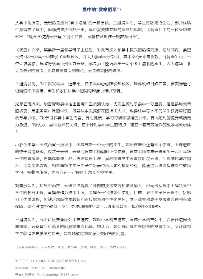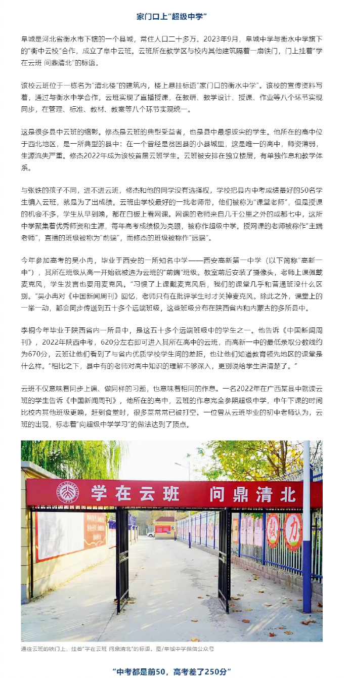 【#云班拔尖能否帮县中培养更多清北生#】#云班同学中考都是前50高考差了250分#阜城是河北省衡水市下辖的一个县城,常住人口二十多万。2023年9月,阜城中学与衡水中学旗下的“衡中云校”合作,成立了阜中云班。云班所在教学区与校内其他建筑隔着一扇铁门,门上挂着“学在云班 问鼎清北”的标语。该校云班位于一栋名为“清北楼”的建筑内,楼上悬挂标语“家门口的衡水中学”。该校的宣传资料写着,通过与衡水中学合作,云班实现了直播授课,在教研、教学设计、授课、作业等八个环节实现同步,在管理、标准、教材、教案等八个环节实现统一。这是很多县中云班的缩影。修杰是云班的典型受益者,也是县中最想拔尖的学生。他所在的高中位于西北地区,是一所典型的县中:在一个曾经是贫困县的小县城里,这是唯一的高中,师资薄弱,生源流失严重。修杰2022年成为该校首届云班学生。云班被安排在独立楼层,有单独作息和教学体系,学校把县内中考成绩最好的50名学生编入云班,就是为了出成绩。