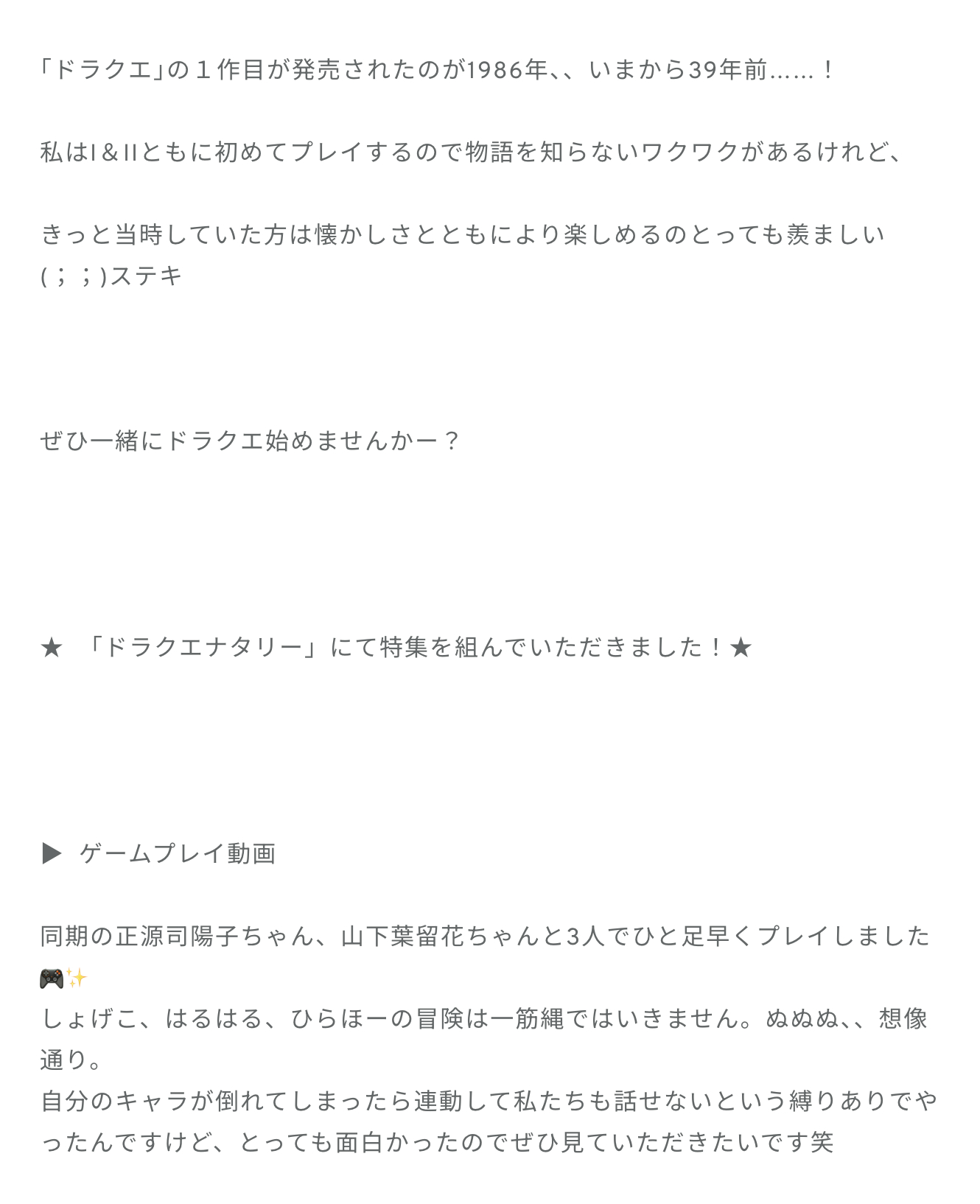 平尾帆夏「今日はですねー、私の愛してやまないゲーム、……いやいや、私も愛してやまないゲーム、HD-2D版「ドラゴンクエストI&II」の発売日です🎉✨️ずーーーっと楽しみにしておりました!!!もう届いてるかな、、今日は帰るの遅いけど、寝る前にちょっとだけでもしたいな、、わくわく。」