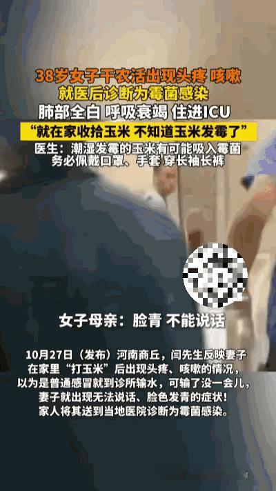 悲剧还是发生了!河南商丘38岁农妇打玉米时没注意防护,竟被霉菌伤到肺全白,这事儿看得人又心疼又后怕。 她当时接触了受潮发霉的玉米,没做任何防护,之后就头疼发烧,以为是感冒去输液,结果半瓶没输完就说不出话了。送到大医院才查出是侵袭性肺曲霉菌感染,连呼吸都成了难题,全靠人工肺维持。 医生说就是发霉玉米的孢子被吸进了肺里。这事也给所有农人提了醒:干农活可不能只拼力气,该做的防护一点不能少。别觉得是小细节,一旦疏忽,轻的生病,重的可能危及生命。 你老家秋收时有哪些容易被忽视的安全细节?来聊聊该怎么做好防护吧~