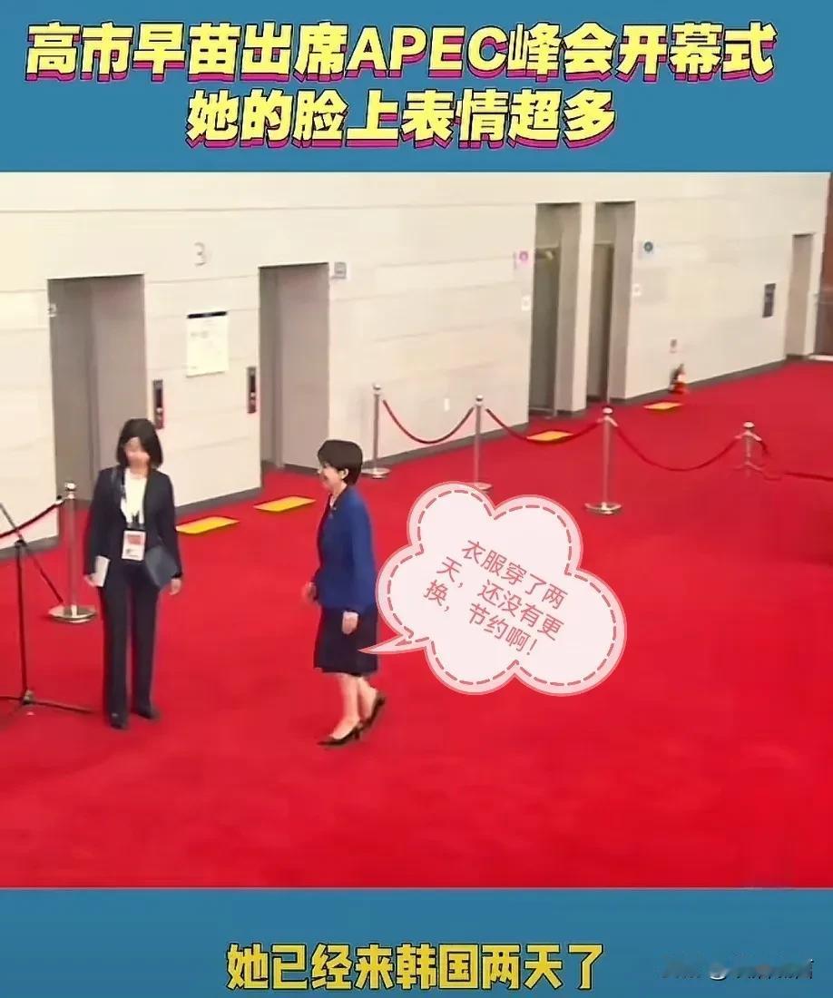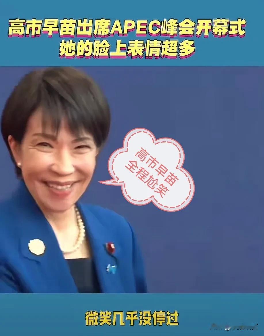 日本首相高市早苗出席APEC峰会,简直是给日本丢尽“脸面”! 高市早苗参加在韩国举行的峰会,从上台就一直尬笑,表情不断,到与韩国总统李志明见面后,全程尬笑。 与李志明握手后,示意她可以下去了,结果她还要与李志明握手不放,搞得李志明都尴尬之极。 最离谱的是他在韩国呆了两天,一直都是这套衣服,韩国气温是1~5度左右,岁数这么大不冷吗?日本首相出访费用不会这么少吧!一套衣服穿二天,而且几十岁大妈了,天气寒冷,穿裙子干啥?