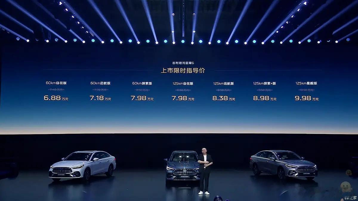 吉利银河星耀6一共7款车型,7.48-10.58万元,限时指导价为6.88-9.98万元,这个价格合理、正常、意料之中。 这个车是A7 EM-i的姊妹车型,两台车在造型上不一样,渠道上不一样,轴距不一样,但平台是一样的,是吉利银河E5、吉利银河星舰7 EM-i初代GEA的加强版,车身彻底改过,底子是非常棒的。 配置分布也是一样的,三款短续航、四款长续航,长续航可以继续享受新能源补贴,短续航主要拉低起售价,同时充当HEV车型在售。辅助驾驶是浩瀚H3、地平线征程J6M芯片;内饰是星耀家族设计,Flyme Auto,这就是模块化了。 对于电池容量,政策是政策,生活是生活,小电池的混动依然市场辽阔,我喜欢小电池的。【来自懂车帝车友圈】