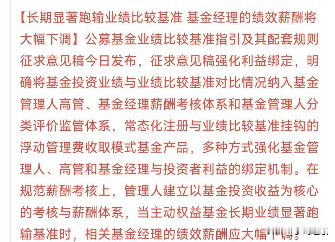 重磅发布,基金薪酬可能出现变革,不再以规模算了,以后拿业绩说话 以前基金经理拿薪酬就是看谁会做广告,谁的规模大,收取的管理费就多,这次征集意见就是为了调整这一情况,里面有几大项。 1.选定就不能随意改动,避免了老鼠仓的情况 2.基金经理的薪酬将会和基金的收益开始挂钩,基金的收益情况直接影响基金经理的薪酬,建立绩效机制。 对于基民来说这是重大的利好消息,现在证监会越来越看重投资者,当然也会更加关心基民的收益,以后基民将会更加安心,放心的对基金投资。