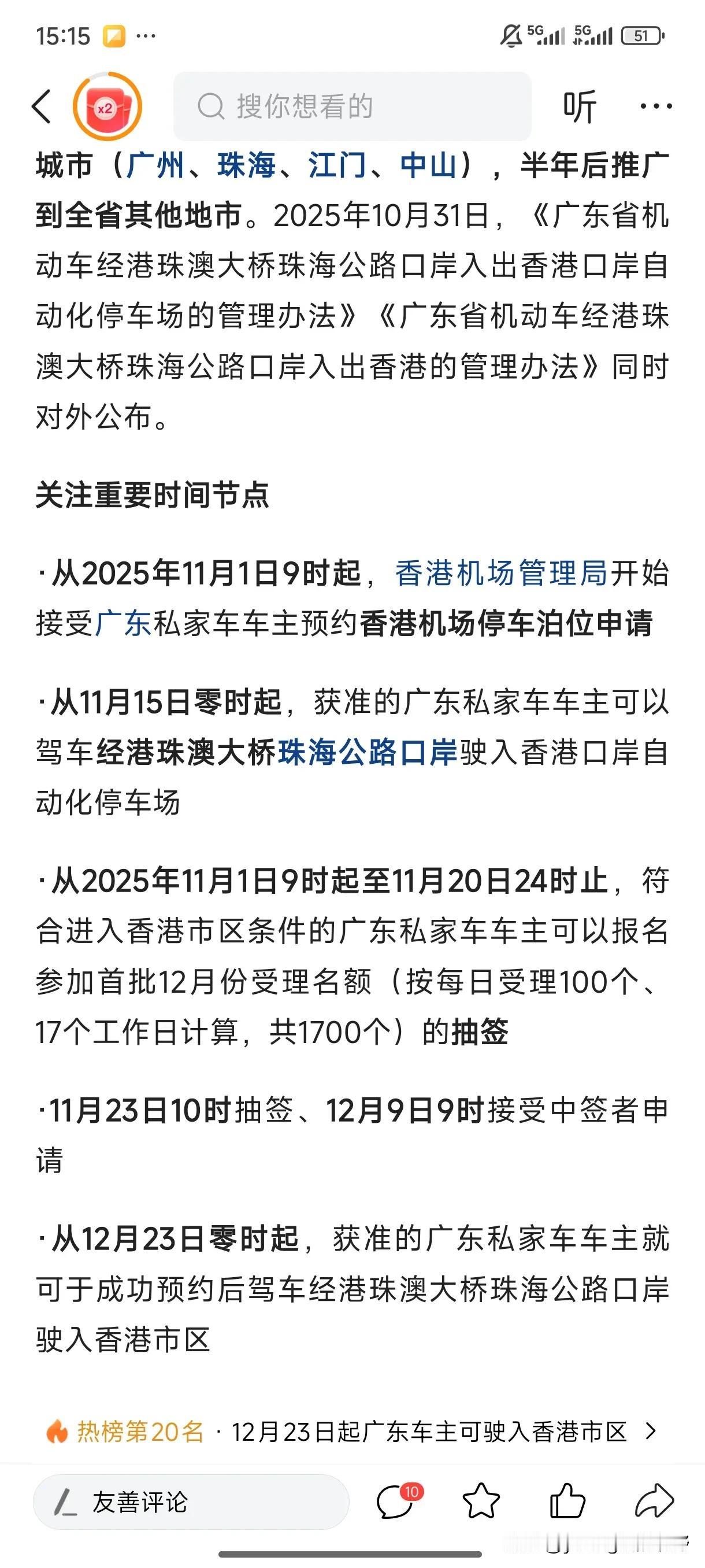 粤车南下香港政策通过了,11月15日起,首批广州、中山、江门、珠海四个城市的车辆可以进入香港。没想到首批城市当中竟然没有深圳。不过也正常,深圳到香港的交通方式很方便,并且进入香港的通道是港珠澳大桥,所以自然是珠海、中山、江门这些城市优先了。目前车辆进入香港是驶入香港机场停车场停放,还不能进入市区吗?那这样的话还不如乘坐公共交通了,香港的停车费价格也不便宜呢。