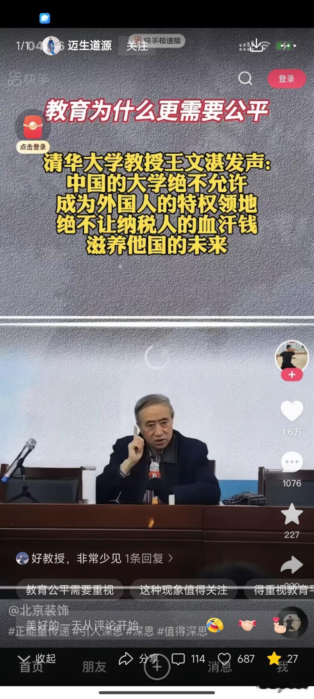 刚刚在头条上看到清华大学王文湛教授的一个言论,他说绝不能让中国的大学成为外国人的特权领地! 他的这段讲话的背景情景,我不太清楚,但我想无非是两个可能,第一是可能一些现象看在他的眼里,所以及时站出来呼吁!第二是有这种风向的变化,所以提前敲敲警钟。依我个人来看,结合我有限的阅历还有从头条上得到的一些信息,我个人倾向于存在一些现象,而这些现象使得王教授这种高级知识分子有了一定的危机感了! 我就是一普通农民,高校怎样其实对我个人没啥影响,但虽处江湖之远,还是国事家事天下事事事关心。 我个人支持王教授的观点!