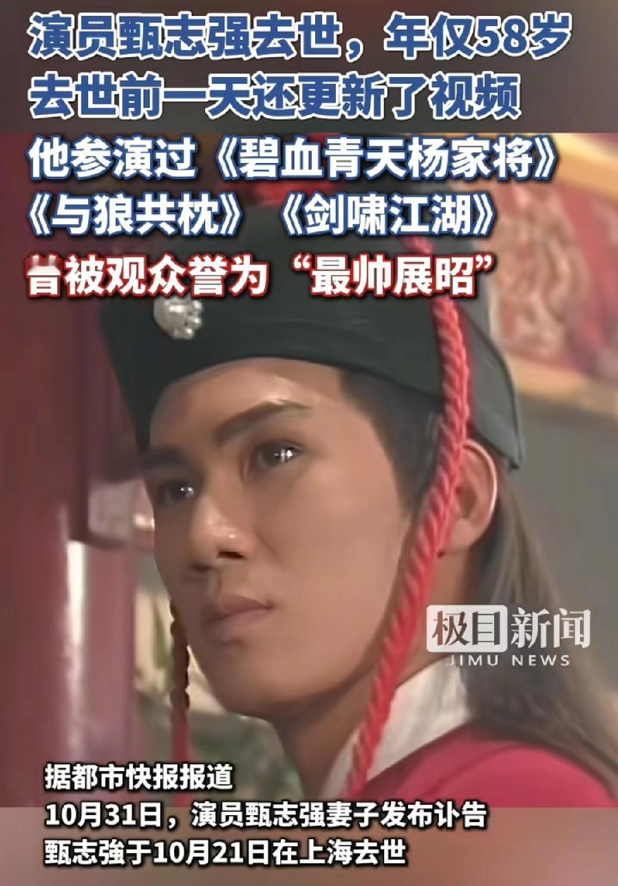 甄志强去世,印象最深2个角色,碧血青天杨家将里的展昭,比何家劲帅,武功很高,甄子丹洪熙官里的高进忠,又非常坏!反差极大的正反派角色,可见甄志强的演技多好!才58岁!看着更年轻,前几天还在悼念许绍雄,没过几天自己猝逝,人生太无常!斯人已逝,音容笑貌犹存!留下了经典荧幕角色,给80后留下美好观剧回忆,谢谢甄志强!一路好走!