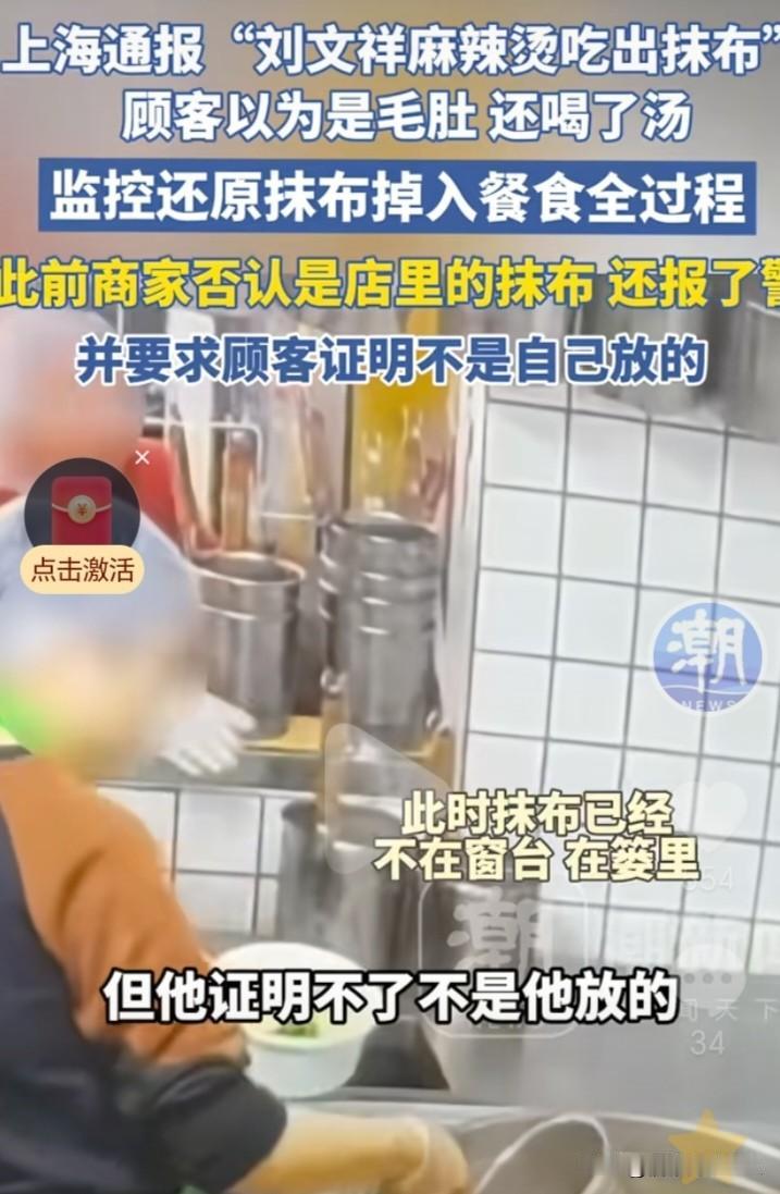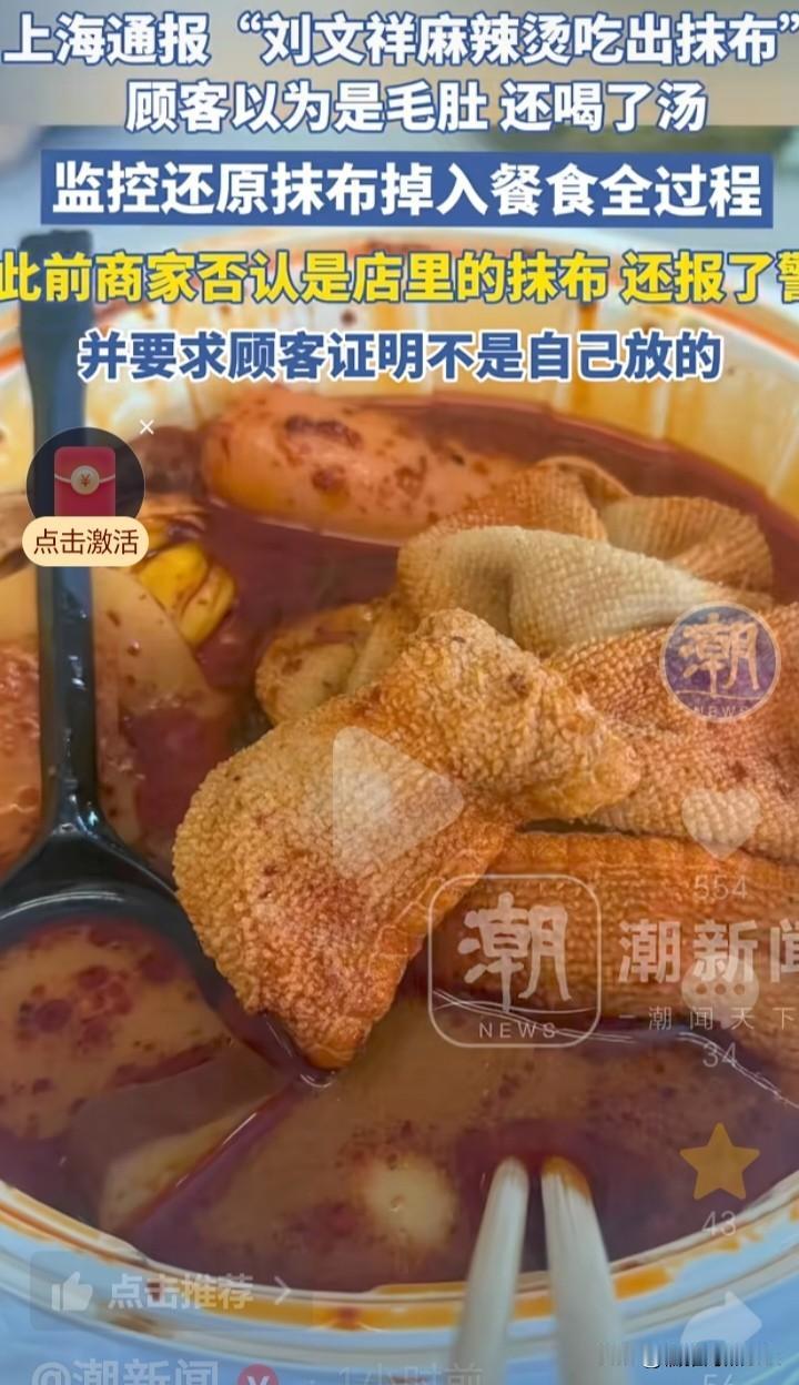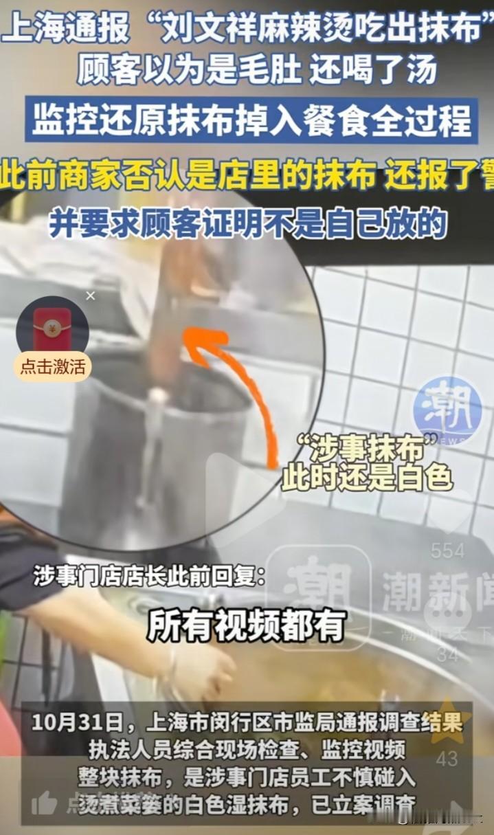 谁的抹布?后续!麻辣外卖吃出整块抺布,店家证明抹布不是自己的,要求顾客证明不是自己放的,上海市监局通告来了。 10月28日中午,有网友发帖称其在刘文祥麻辣烫上海爱琴海店点的外卖中吃出整块抹布,他以为是毛肚,还喝了汤,直到看见线头,才确认是块抺布。 当事人将餐碗中带有抹布的图片发给门店,门店随即提出退款的解决方案。 当事人对仅退款的处理方式不认可,门店提出将带有抹布的外卖取回进行核实,核查是否有员工不慎将抹布落入餐中的情况,遭到当事人拒绝。 门店工作人员称,他们查看了视频,能够证明抹布不是他们店的,他们出锅,进锅,抓菜的视频都有,要求当事人证明抹布不是自己放的,但当事人电话不接,门店已经报警了,警察会找当事人的。 有视频,自己也仔细核实过了,听了门店工作人员很有底气的介绍,很多人相信了门店的说辞,认为该顾客想白嫖及索赔,说的话也很不好听。 10月31日,事件大反转,上海市监局通报调查结果,执法人员综合现场检查,监控视频还原真相,整块抺布是涉事门店员工不慎碰入烫煮菜篓的白色湿抹布,已立案调查。 监控清楚的显示,一块白色的抹布放在窗台边,一名工作人员在拿东西时不慎将抹布碰落,刚好掉进了烫煮菜篓中。 自己家的抹布还是认识的,放在哪个地方才会发生这种情况也应该清楚,视频中那块抹布也很显眼,只是一闪的镜头,抹布就不见了,店家抱侥幸心理,以为不容易发现。 幸亏被发现了,否则顾客想证明抹布不是自己放的几乎不可能,由误解而造成的伤害是很大的。 当事人也很精明,没让带抹布的餐品被店家收回,否则还真不好说。 白嫖的人也有,但是少数,正是因为有些白嫖的人乱了规则,打破了秩序,让门店似乎找到了怀疑的理由,同时也给真正维权的消费者也造成了困扰和伤害,对这种人坚决打击。 所以,没做亏心事,不怕鬼敲门。坚决合理合法维权,总能发现蛛丝马迹,否则就是反咬一囗的伤害。