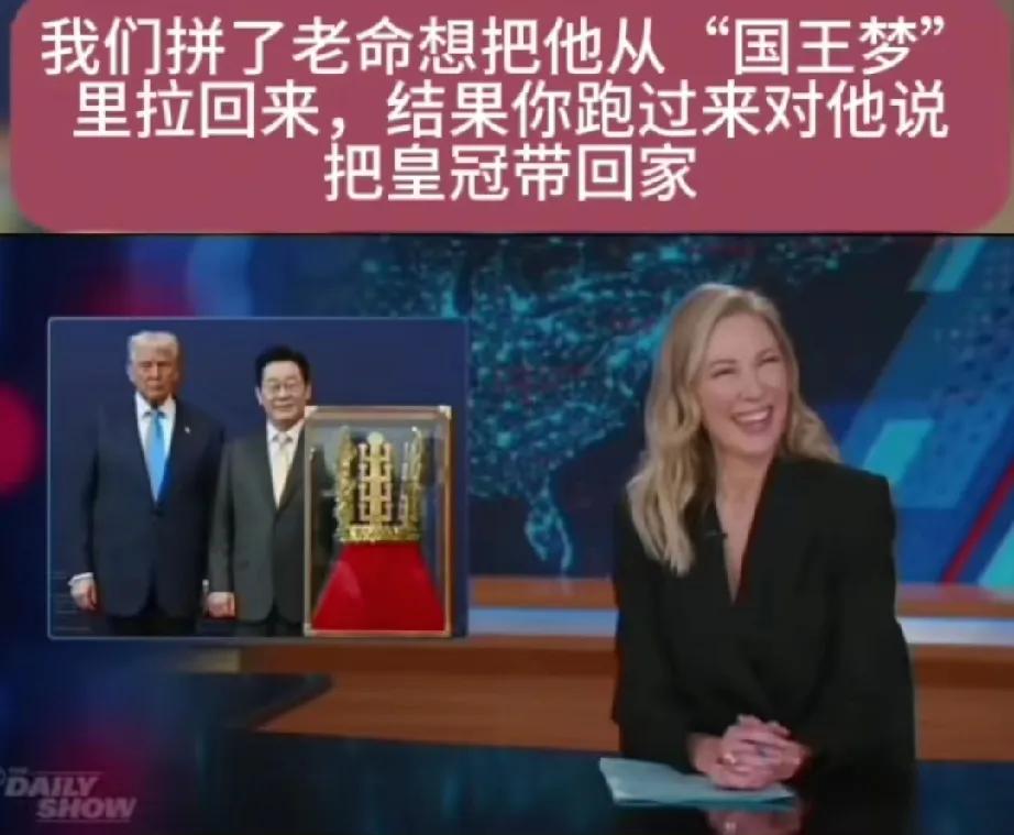 美国女主持人在线吐槽韩国:真想感谢特朗普那就直接送钱,我们好不容易打破了他的“国王梦”,你们转头就送了王冠。 其实这事韩国做的真不地道,前段时间美国各州大乱,700万人上街抗议特朗普,而这场抗议的口号就是“不要国王”,副总统万斯也很应景,直接p了个带王冠的图以此来回击抗议者。 本来各州街头的混乱都快平息了,李在明突然选在这时拿出了一顶真“镶金”王冠,可想而知特朗普接下来会做啥,就是不知李在明此举是无意为之还是故意的了,兴许就想来把火上浇油也说不定!