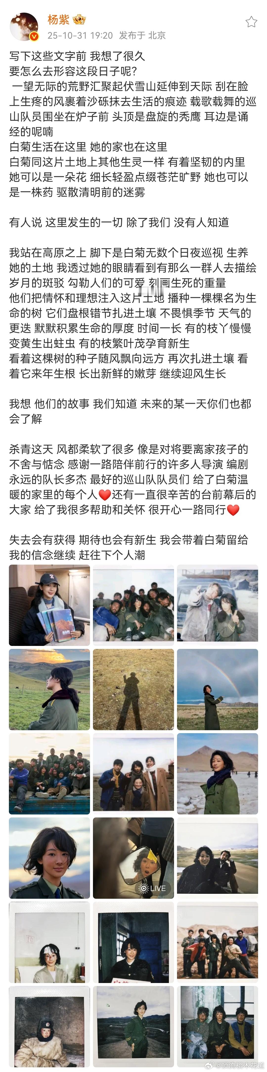 杨紫发文告别生命树剧组,配图18宫格,看得出来满满的都是回忆和不舍,她说白菊有着坚韧的内里,她可以是一朵花 细长轻盈点缀苍茫旷野 也可以是一株药 驱散清明前的迷雾。