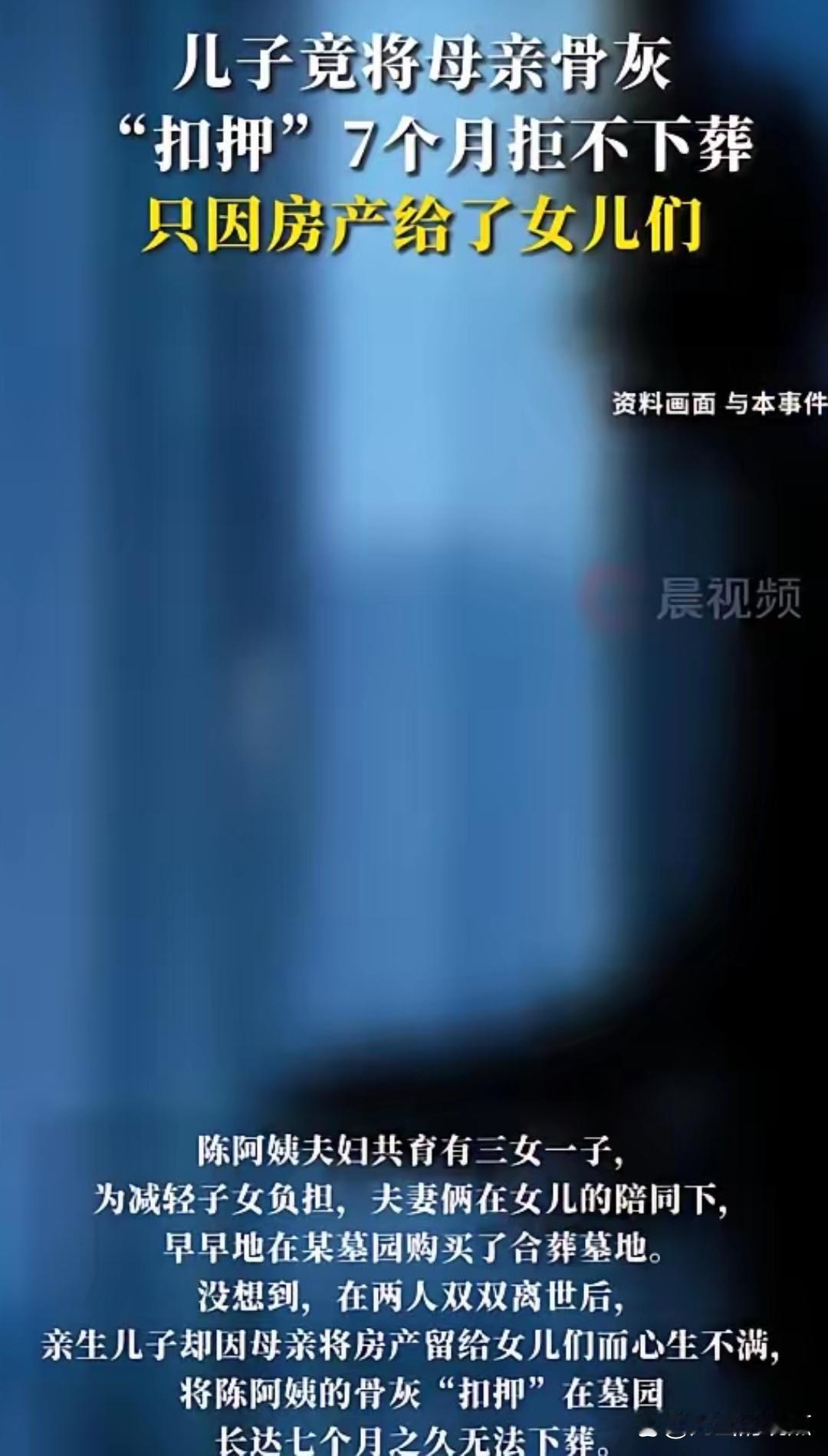多家媒体报道了上海青浦一桩“骨灰被扣”案:直到给母亲办丧事,独子王某才惊悉,母亲名下那套市值几百万的房子,早已通过公证遗嘱全部留给3个姐姐,自己分文未得。 盛怒之下,他当场要求姐姐们放弃继承,遭拒后竟把亡母骨灰“锁”在墓园,一放就是7个月,扬言“房子不给我,妈就别想下葬”。 这场闹剧,把“孝道”二字撕得粉碎。 早年,陈阿姨夫妇为省心,早早在青浦买好合葬墓,墓穴证上“认购人”写的是儿子王某,但使用权明确归夫妻二人。2016年,老伴儿先走一步,顺利落葬,墓穴证也顺势交到王某手里,当时一家人尚和气。 2022年,陈阿姨去世,王某忙前忙后办丧事。他满以为“独子继承天经地义”,却在遗产清点时被告知:母亲早已把房子通过公证遗嘱悉数留给三个女儿。 王某瞬间情绪炸裂。 遗体火化后,他拿着墓穴证直奔墓园,撂下狠话:“我不到场,谁也不许动!” 骨灰就此被“扣押”,成了谈判桌上的筹码——要下葬?先签放弃房产声明。 三个姐姐多次沟通无果,只能将弟弟连同墓园一并告上法庭,请求法院让母亲早日入土。 庭审中,王某辩称自己是认购人,有权决定落葬时间,遗产分配不公不能殃及母亲后事。 法院一句话驳回: 墓穴为父母购置,使用权归老人;子女只能代行权利,不能借机勒索。 “入土为安”既是公序良俗,也是法律底线。 最终判决: 墓园与王某必须立即配合三姐妹完成落葬。 7个月的僵持,王某不仅半平米没拿到,还被邻里贴上“不孝”标签。 扣押骨灰,实质已侵害姐姐们的合法祭奠权。 母亲如愿入土,可兄妹情分彻底塌方。 陈阿姨立遗嘱自有她的权衡,却没想到身后竟成子女撕破脸的战场。 房产再大,也大不过“入土为安”四个字; 亲情再薄,也不该拿骨灰做筹码。 争到金山银山,丢了人品与亲情,终究两手空空。 你怎么看?