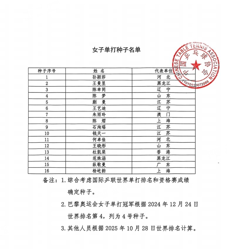 官网进行备注:1. 综合考虑国际乒联世界单打排名和资格赛成绩确定种子。