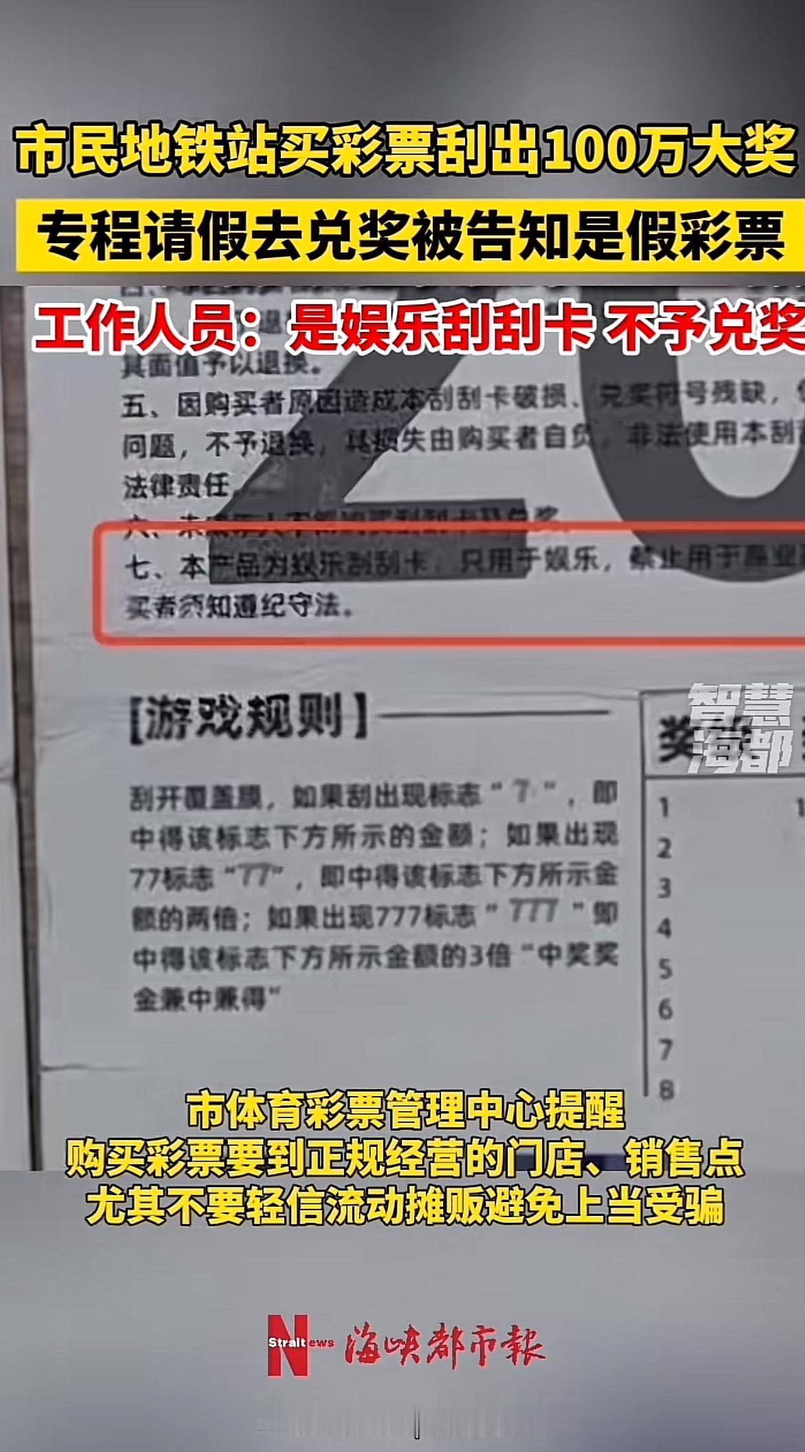 最近苏州一市民在地铁站流动摊贩那买“彩票”,刮出百万大奖,请假去兑奖却被告知是假