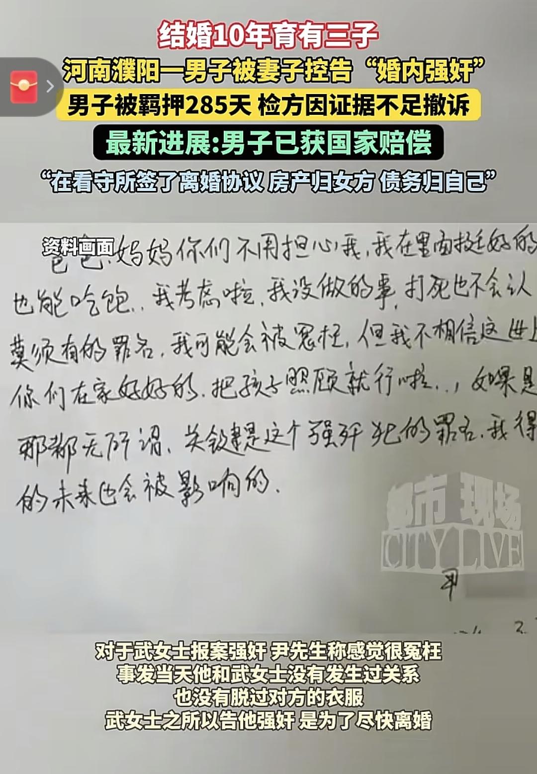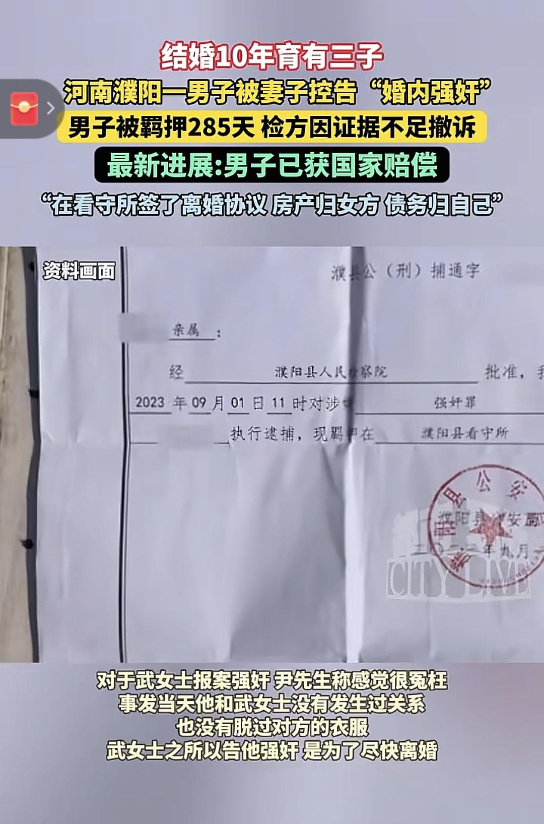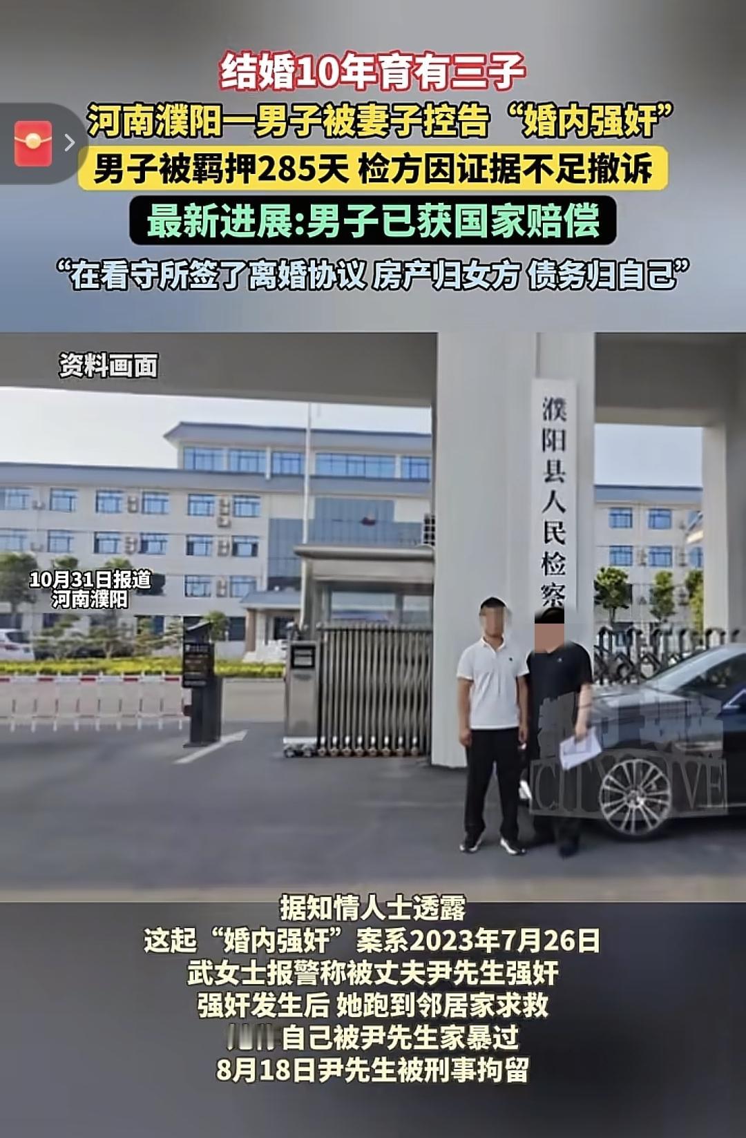 河南濮阳“婚内强奸案”因女方证据不足已经被撤销,羁押了285天后终还男子一身清白! 记性很深刻他当时说“爸爸妈妈不用担心我,我没做过的事情,我坚决是不会认的”,就凭这一口气,他不认罪。 现在他已经获得了国家赔偿,和那个想要离婚的妻子已经在看守所签订了离婚协议,房子归女方,债务归自己,也算是个负责任的男人了,只是可怜了他们共同的两个女儿一个儿子! 听男方说“从小女儿一岁开始,女方就到处找律师打官司,要求离婚,法院两次都没判离,为了离婚女的告他婚内强奸”,想不明白,一个不爱你的女人,想要离婚就成全他啊,哪怕是损失一些钱财,现在这个结果还是损失了一套房啊,还闹的这么大。 其实现在大伙还有一个疑惑,这三个孩子都是男子的吗?