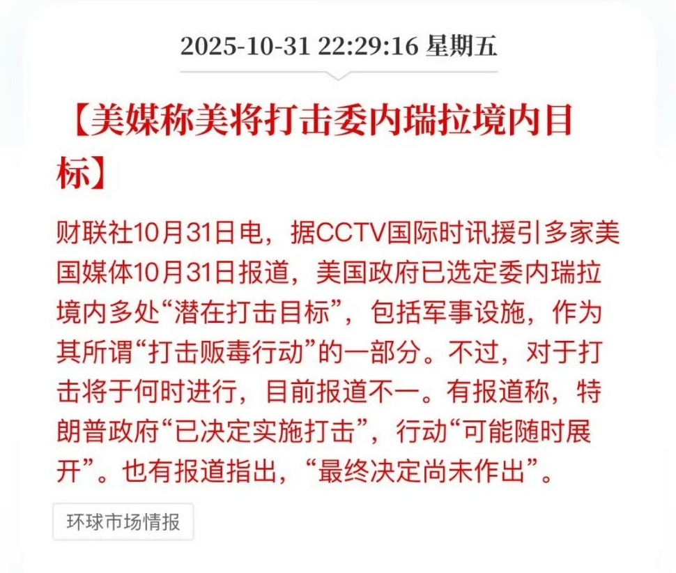 美将打击委内瑞拉境内目标美国计划打击委内瑞拉境内目标,本质是地缘政治与资源利益的双重博弈。委内瑞拉拥有全球最大石油储量,且不愿屈从美国主导的秩序 。美军此次部署剑指关键基础设施,既想夺取能源控制权以维护美元霸权,也意图震慑拉美左翼政权、排挤域外力量 。这种将“后院”视为私产的霸权思维,只会引发地区国家更强烈的反抗,让拉美再度沦为博弈牺牲品。
