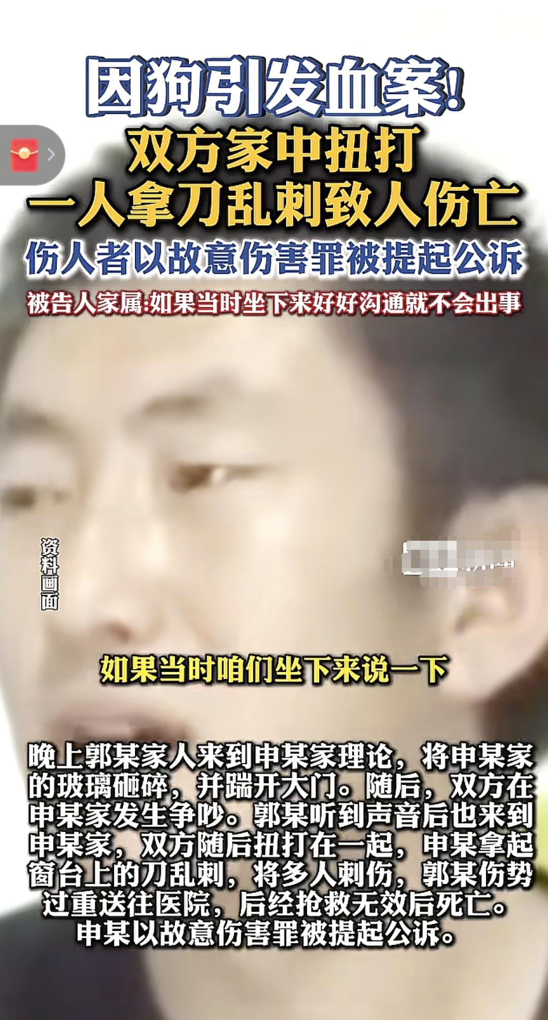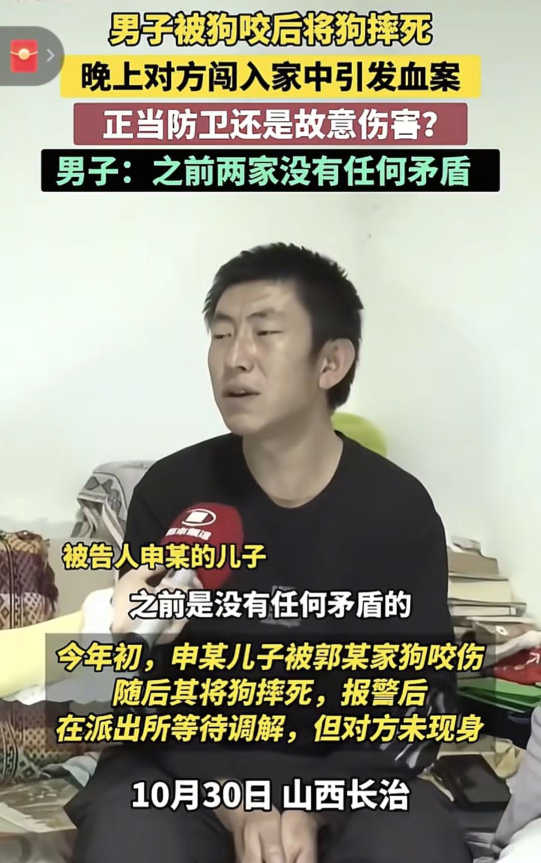 山西长治,一条狗咬人引发血案 今年1月份申某儿子被郭某养的狗咬伤,申某一气之下将狗摔死,当时郭某妻子就报警了,申某去派出所等调解等了大半天,但郭某家没有理会未出现,在采访中申某说“如果咱们当时坐下来说下,可能不会出现后面的这些事情”,之前两家没有矛盾的,如今两家走向这般局面,很难收场! 由于白天申某将狗摔死,报警后又不愿配合,晚上郭某带人闯入申某家理论,打砸人家家里玻璃窗,踹开人家家大门,一行人将申父压在身体下面打,慌乱中申某捡起一把dao乱挥,导致多人受伤,郭某受伤最重,后面离世了。 如今申某以故意伤害罪被提起公诉,大伙纷纷认为只能算是防卫过当,都打到家里来了,狗主人非法闯入他人住宅并损坏他人财物,再加上寻衅滋事,如果这都还不算正当防卫就真说不过去了! 入室打砸抢是什么性质,自身财产生命要保护吧?