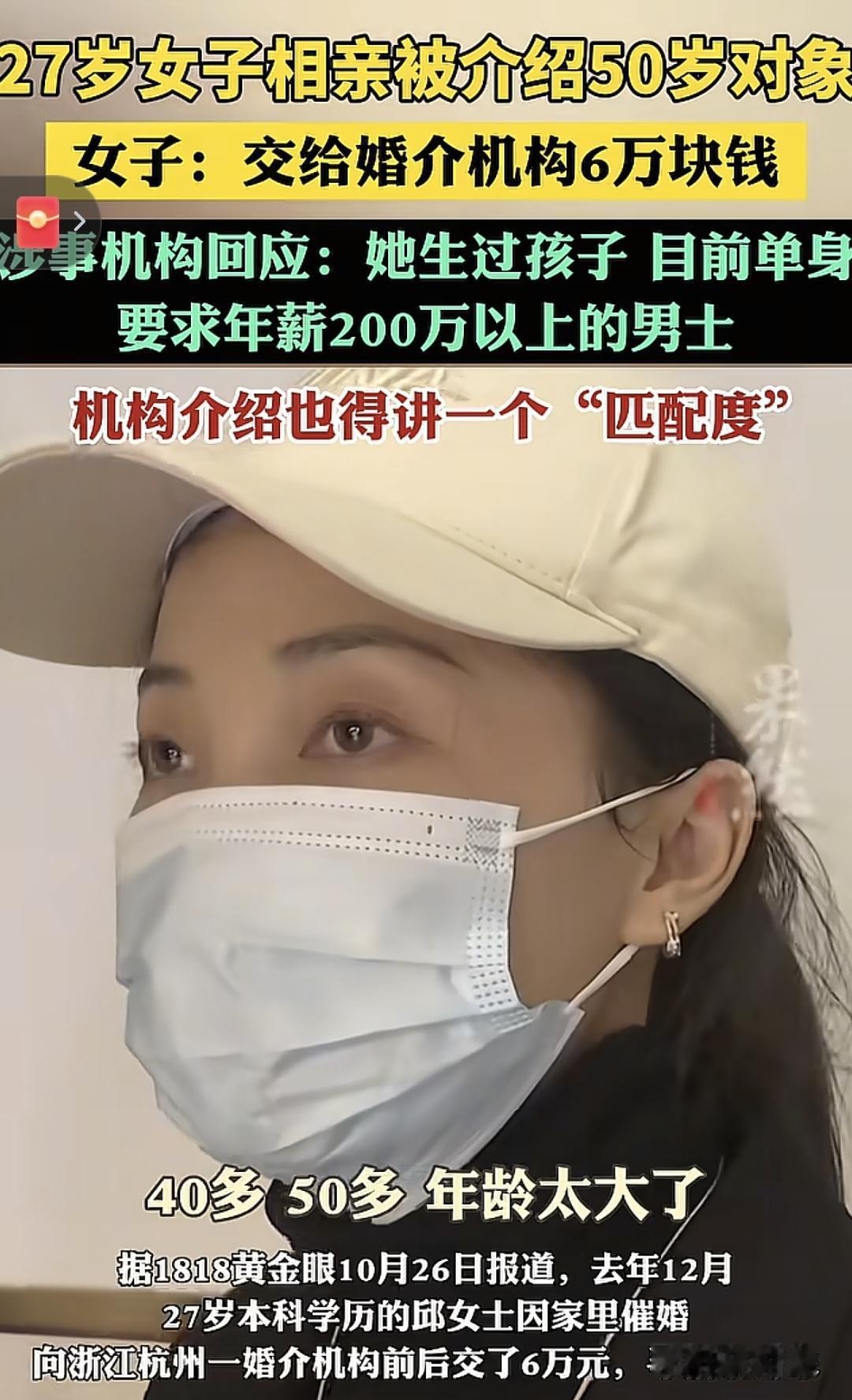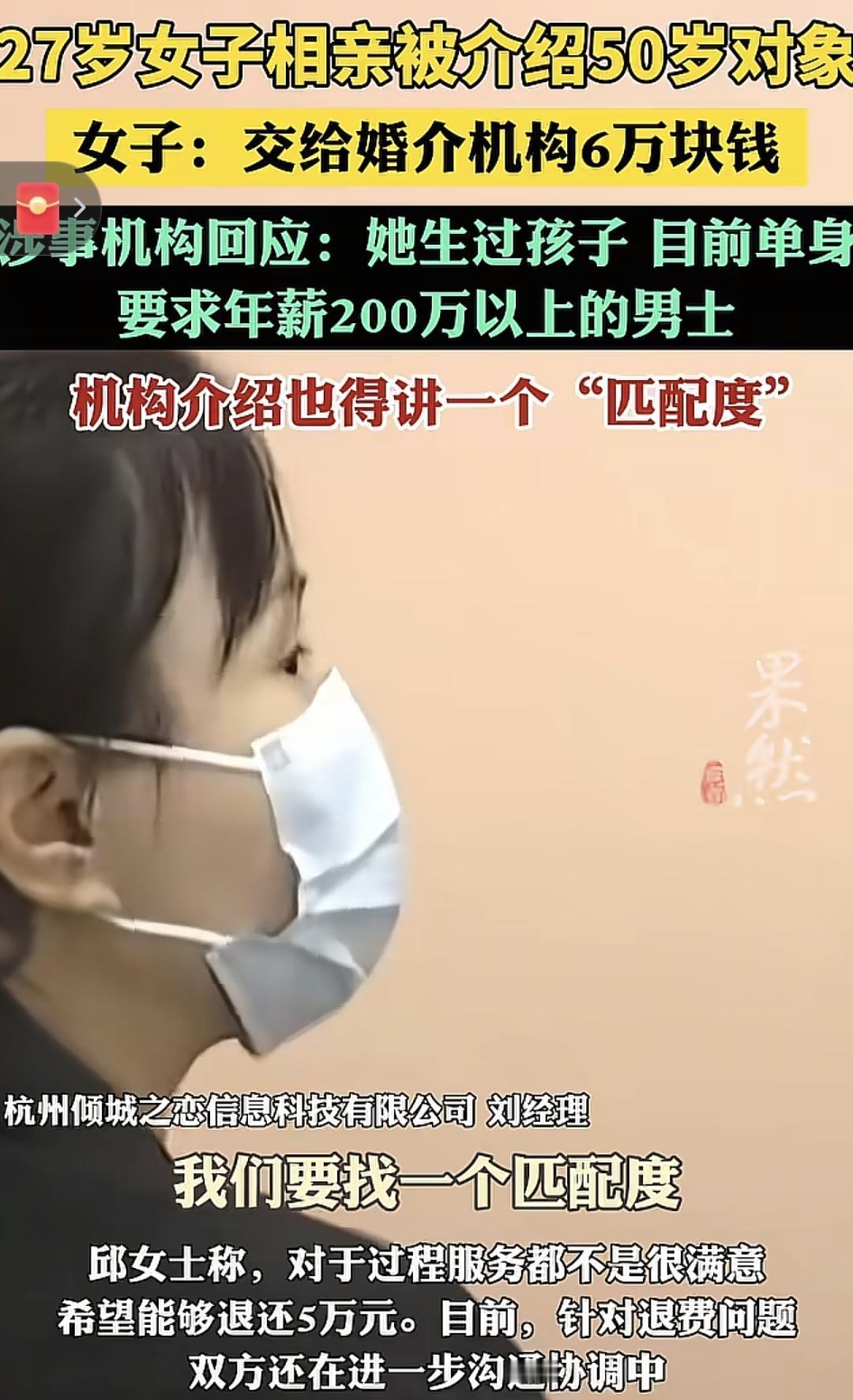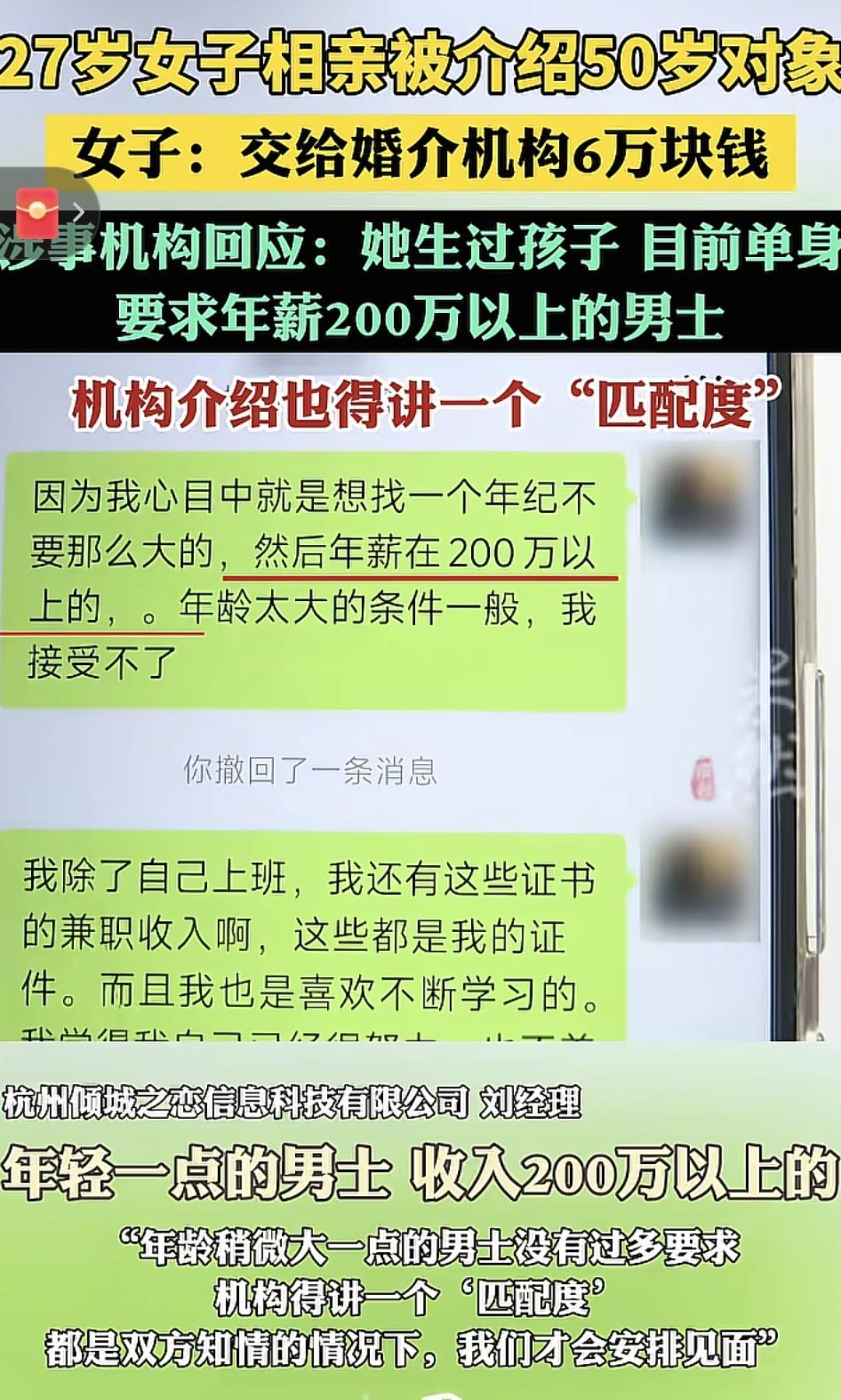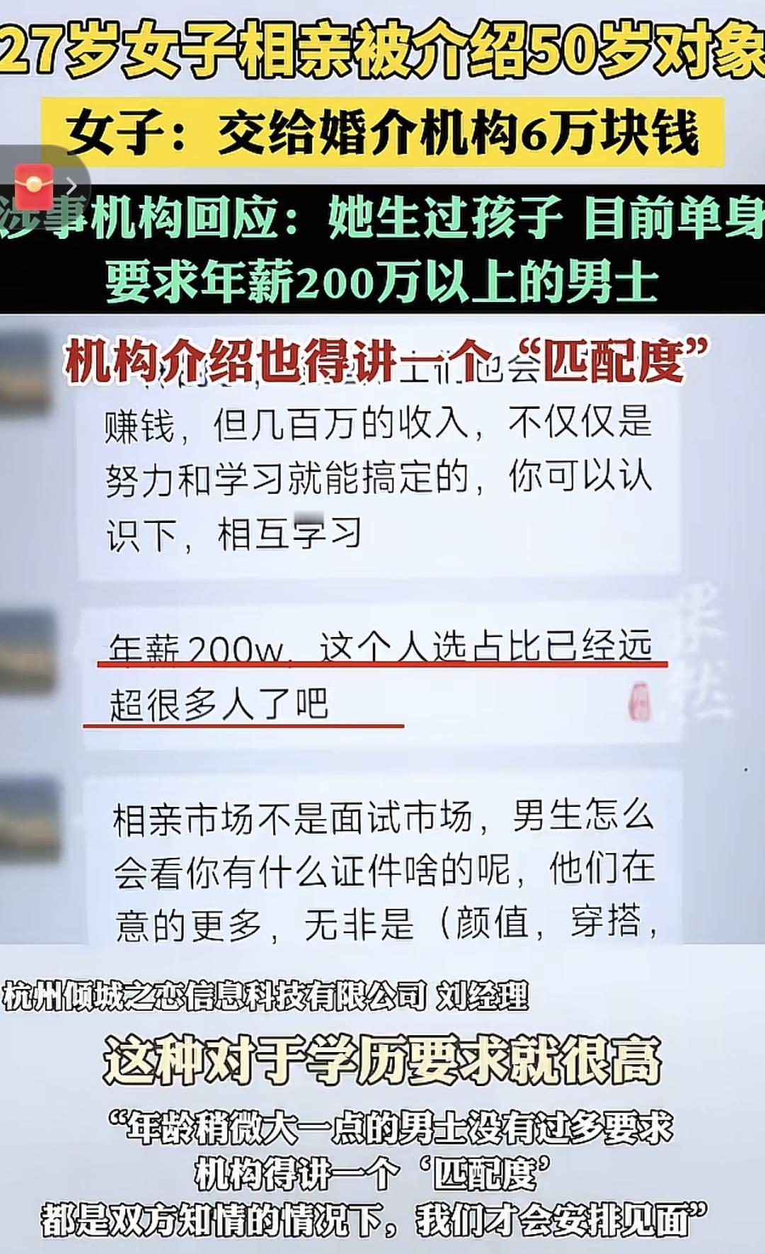 27岁离过婚生过孩子的单身女士要求婚介所介绍年薪200万的男士,可婚介所每次都给她介绍50.60岁的男人,对此该女士非常不满意,要求机构退费6万元! 机构经理就差明说女子条件差了! 女子给机构经理说“我心目中就想找个年轻一点的,条件好的,我又有好工作,我还爱学习,有很多证书” 机构经理就说“收入几百万,那不是光看学习和证书就能搞定的,年纪大一点的要求没那么高,主要看颜值,穿搭那些”,说白了,人家就是告诉你,有钱人想找漂亮的,年轻的,50多岁找个20多岁的,无非就是图美色,而你却拿出所谓的证书和学习能力来要求我给你找年轻富豪,超级ceo,这根本就找不到塞 人家还用了一个很高级的词“不匹配”! 现在女子找不到高富帅,梦碎了就找机构退费,她真以为交了钱就能实现愿望?霸道总裁爱上离婚带娃的我? 怕不是梦还没醒哦! 该说不说,这中介真良心,还给她找了个年薪200W的,这回该支持婚介机构了吧?