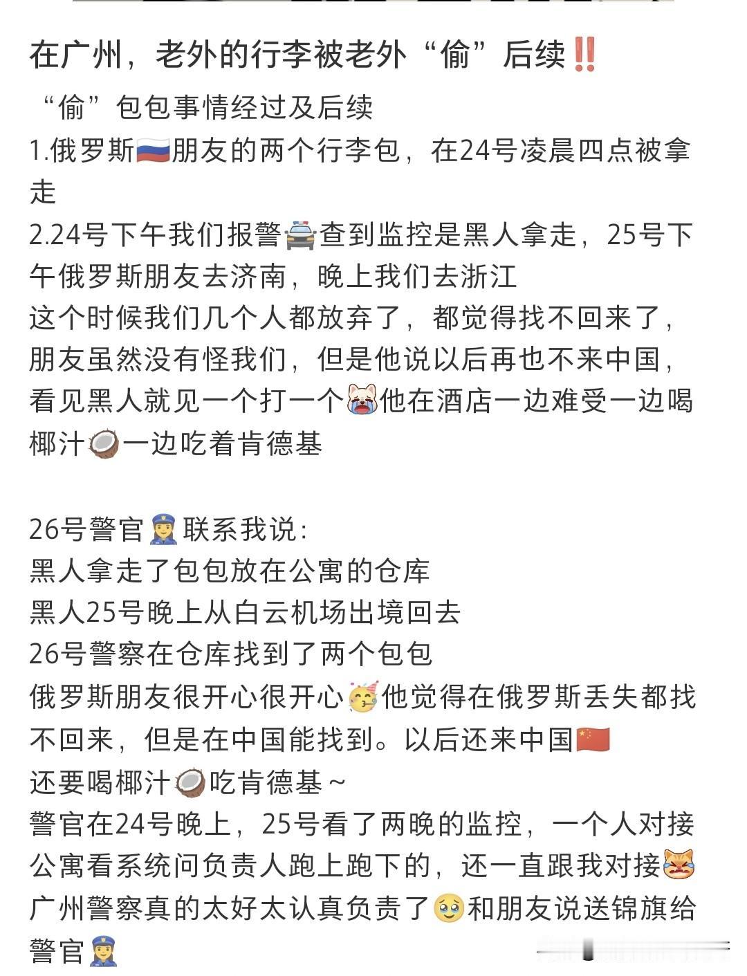 广州黑人那么多,是否会形成隐患? 网上一网友曝光自己和俄罗斯朋友,在广州行李包丢失,报警查看监控发现被一个黑人拿走。以为无法找回了,表示自己的中国之旅不是很愉快,以后不会再来了,甚至表示看到黑人见一个打一个[捂脸] 两天之后,可能是黑人良心发现,把行李包放到了公寓的仓库。虽然不排除大部分是有良心的,但是存在极少数心术不正的黑人,是否可以在犯错后就在履历档案,不再允许入境? 对于开头的疑问,我想我们的帽子叔叔肯定会把他们管理好,不会形成任何隐患!