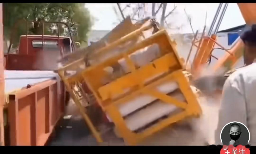这样把生命置于危险之中,千万不能站在吊起的货物下面,随时都可能出意外,这样的事情还经常发生。 这是一工厂用叉车吊东西,这东西很沉,一看就知道超载, 叉车把东西吊起,一男子为了不让货物晃动,站在叉车旁边用手扶着货物呢,离货物太近了,结果吊货物的绳子断了,男子被货物砸下来,生命有危险了。 叉车装车,人一定要离远点,这个视频中的人能不能活着出来都是未知数。