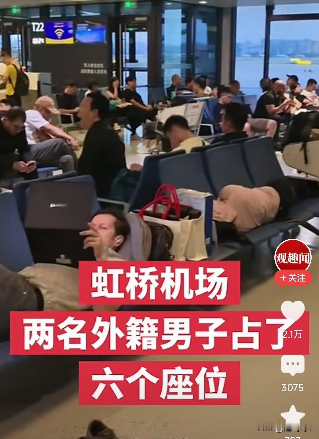 上海虹桥机场内发生外国人在候机大厅占位置睡觉不文明现象,虹桥机场管理人员应该给与制止,两个人占6个位置,这是公共场合,这样做很不文明,无关国籍,这是公共的地方,不能做不文明行为,让来机场候机人员怎么看呢? 人来多了,别人不好意思去喊这两个躺着的人,别人就没地方坐,机场工作人员应该过来给这两个人喊起来。 这样躺下有对座椅损坏的,工作人员应该出面让这两个人赔偿,要及时止损。
