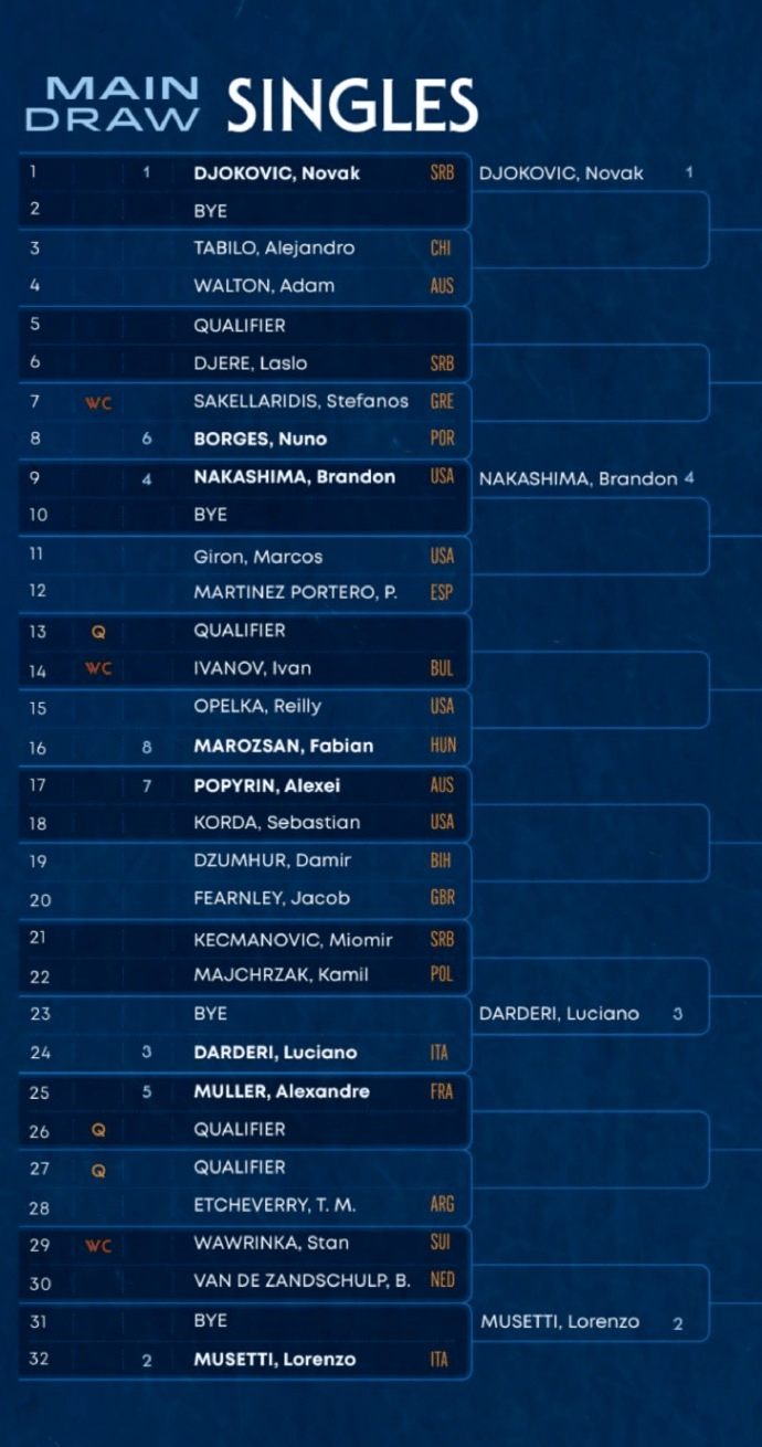 穆塞蒂作为2号种子出战,在第二轮将迎战瓦林卡和范德尚舒普之间的胜者。